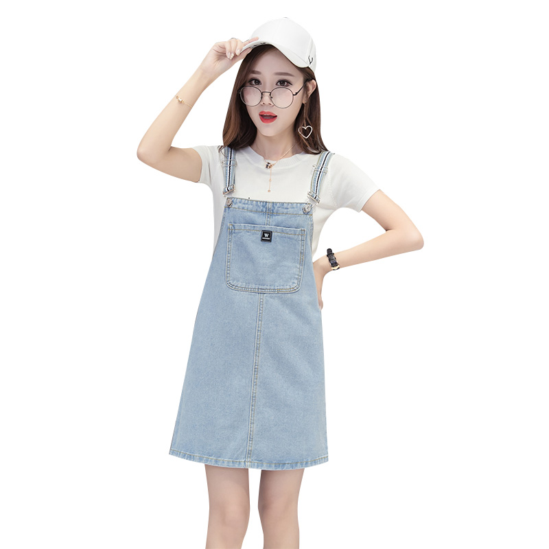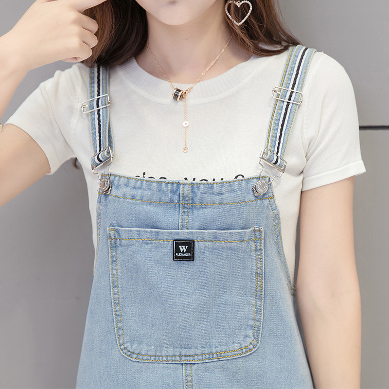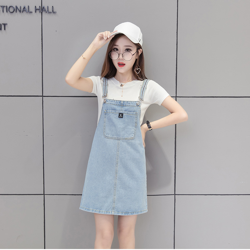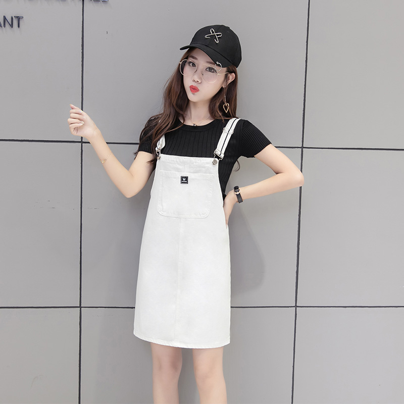/ 夏季韓版高腰牛仔背帶裙女白色裙子中長款百搭口袋半身裙學生