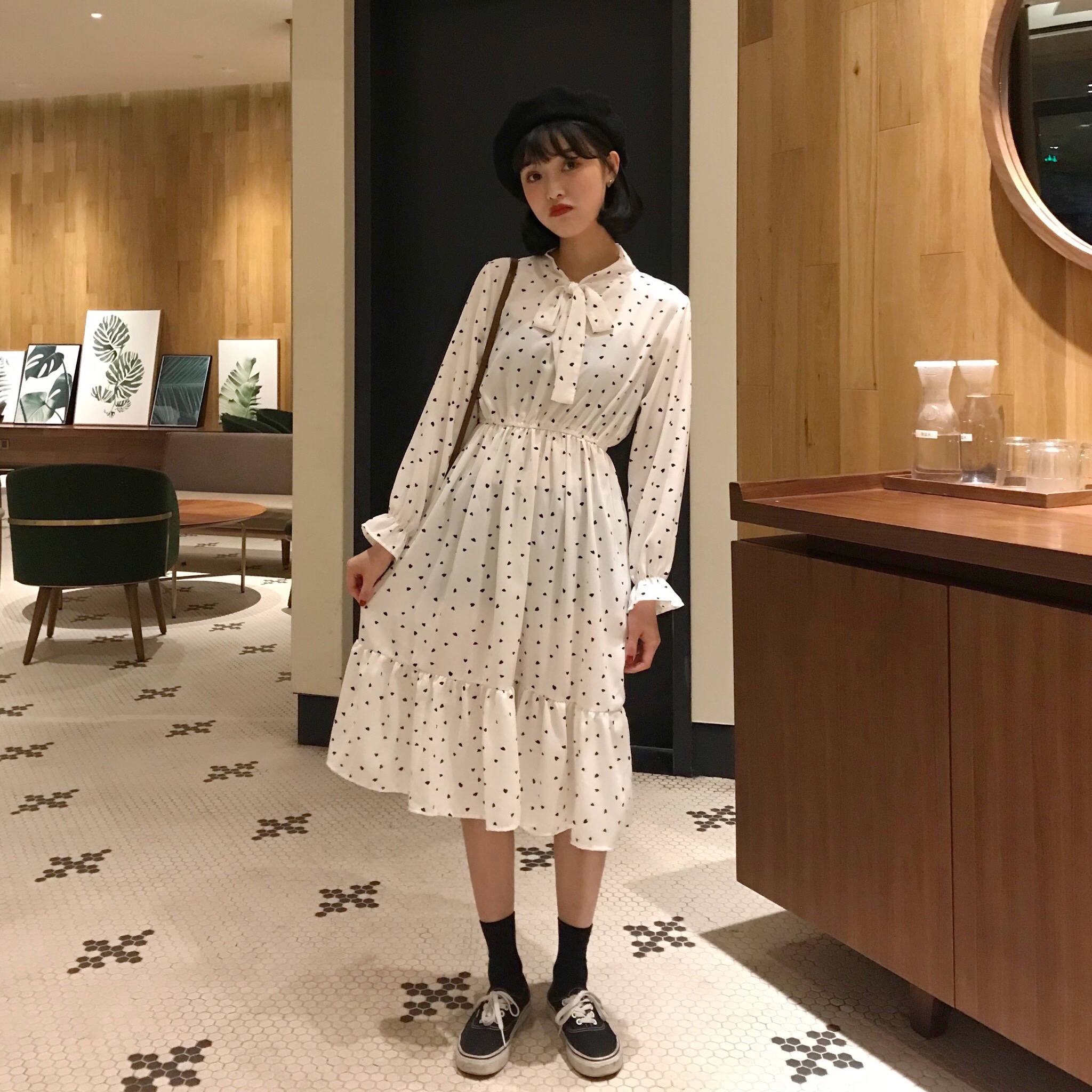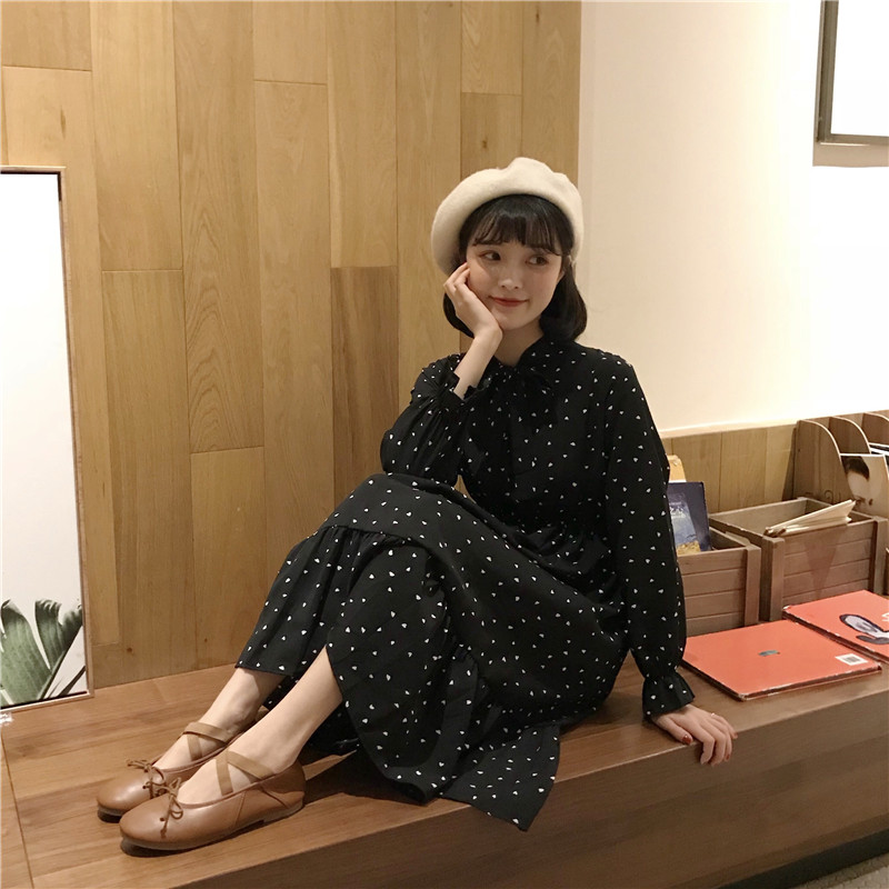 / 韓版時尚休閑套裝秋季針織馬甲+高腰雪紡波點長袖連衣裙兩件套女