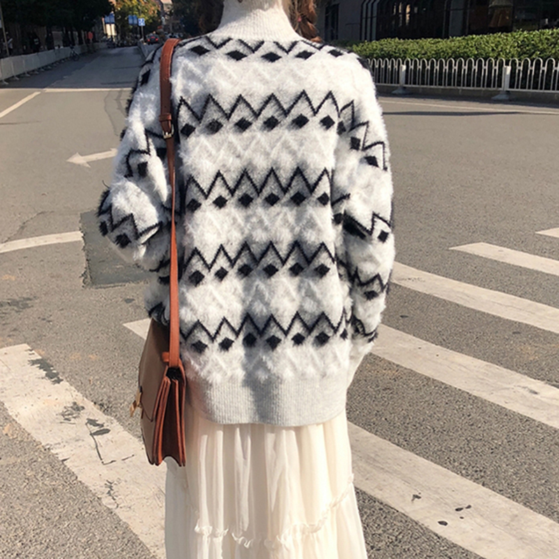 / 半高領慵懶風毛衣女秋冬情侶裝2018新款時尚拼色針織外套長袖上衣