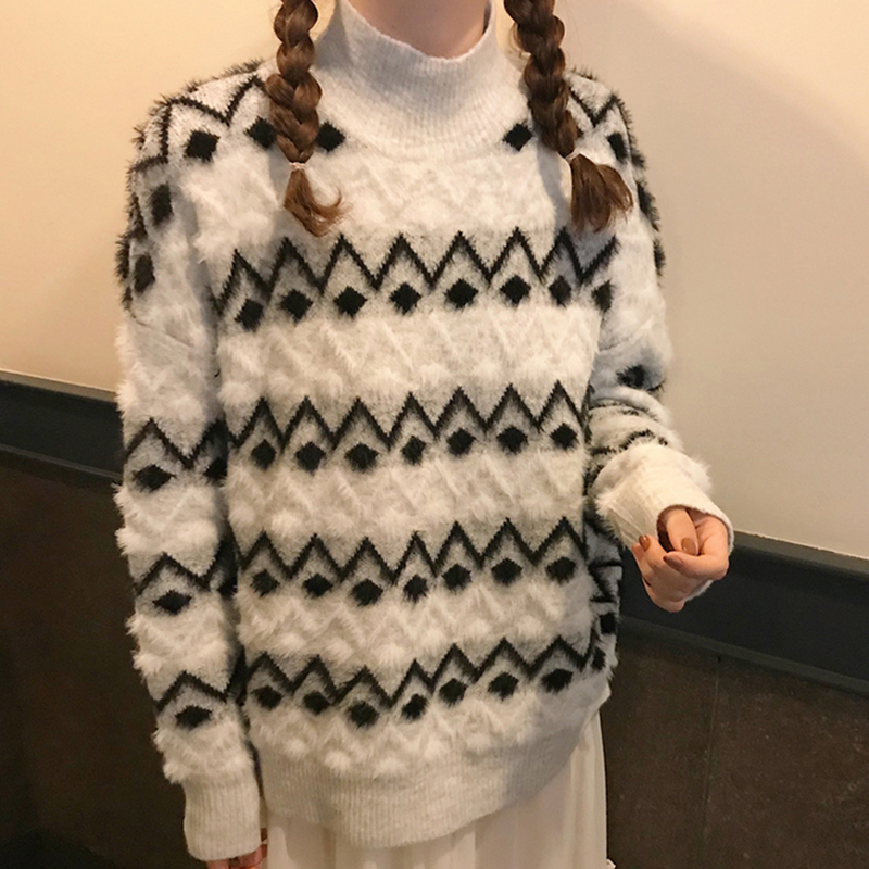 半高領慵懶風毛衣女秋冬情侶裝2018新款時尚拼色針織外套長袖上衣