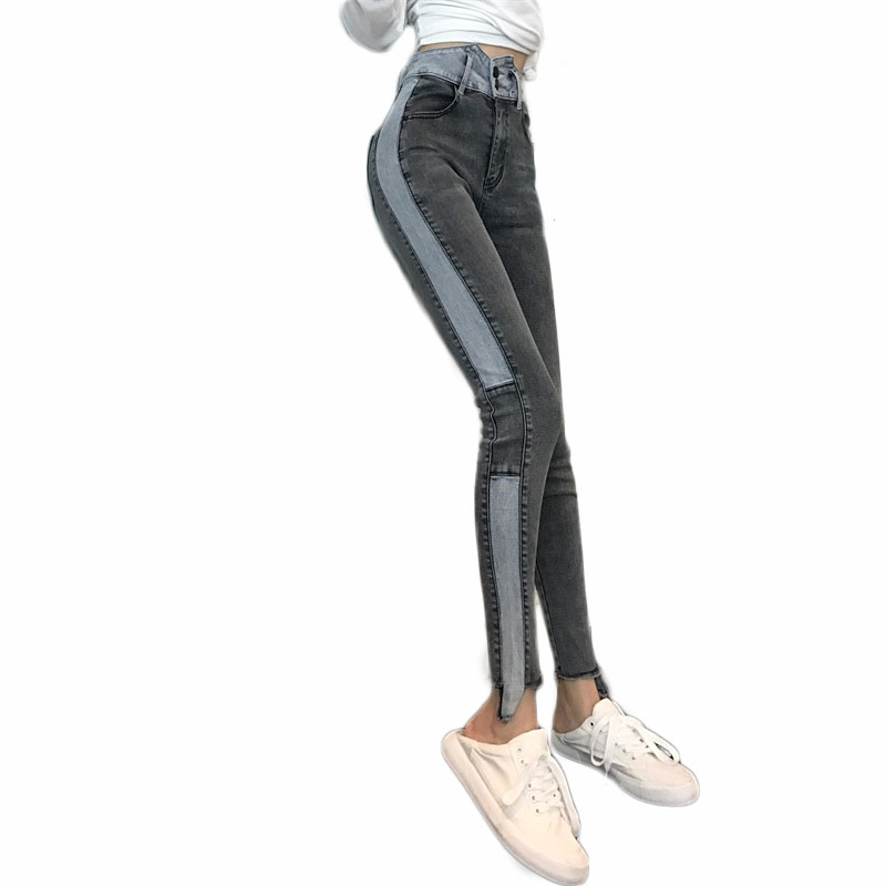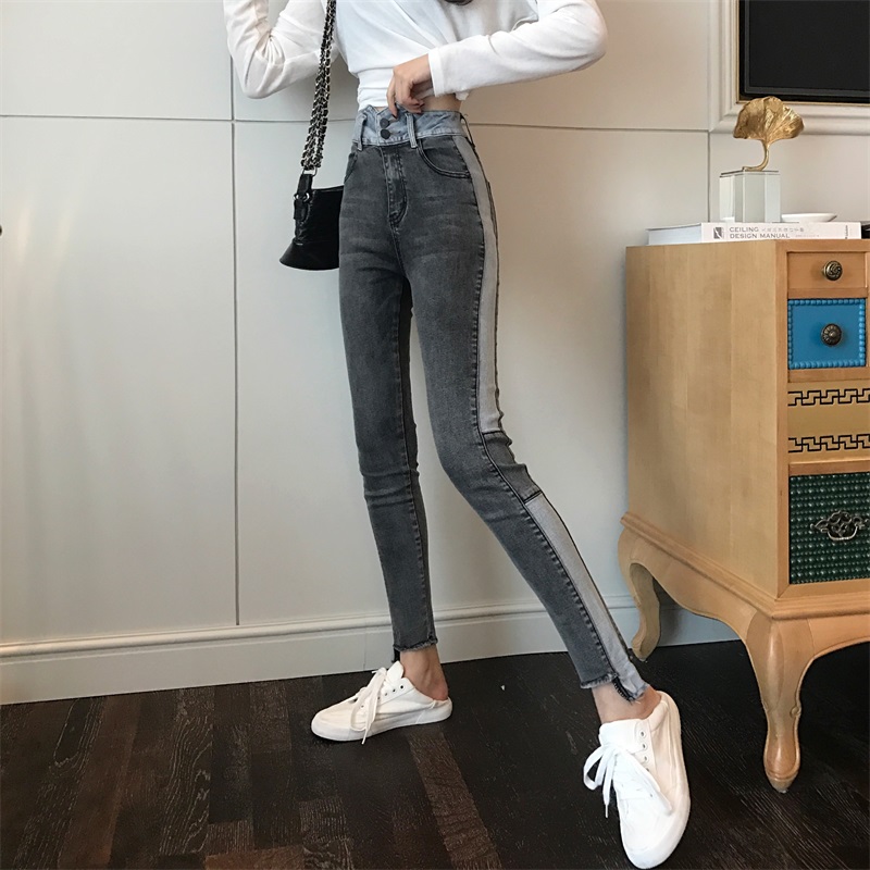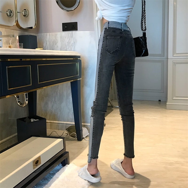 韓版時尚高腰拼色牛仔褲女秋冬2018新款緊身顯瘦小腳鉛筆褲九分褲