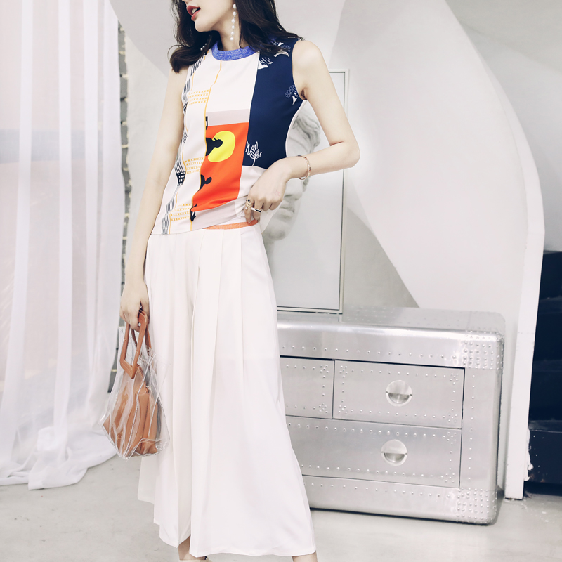 s秀洋氣名媛套裝女夏2018新款歐洲站闊腿褲無袖上衣時尚兩件套裝