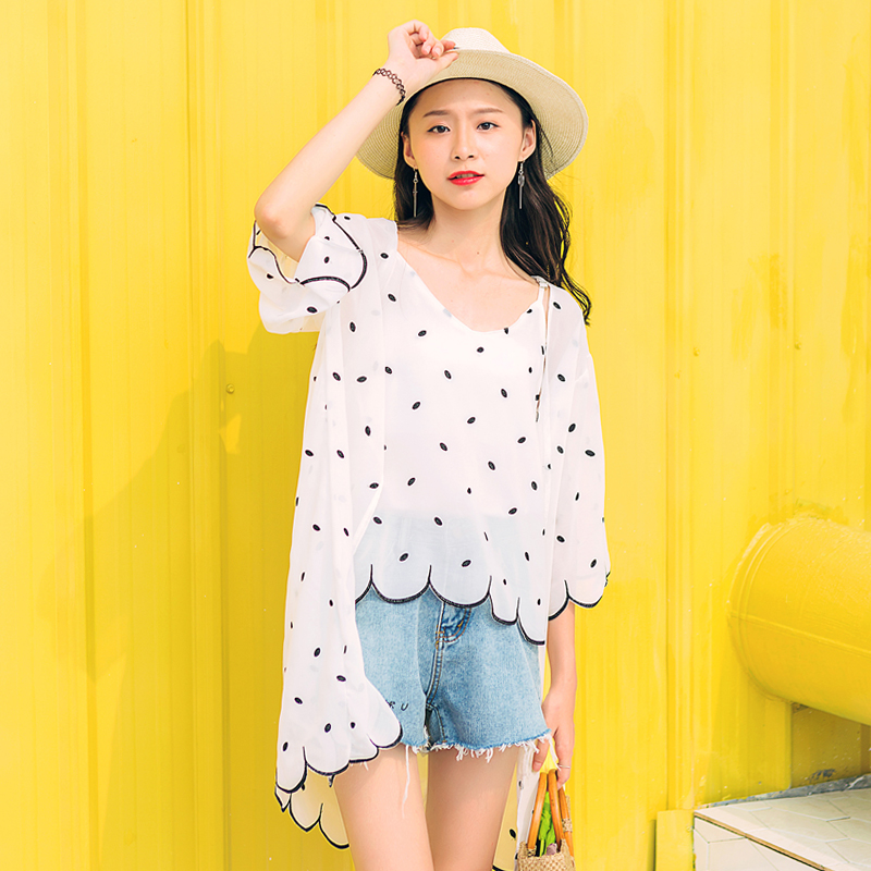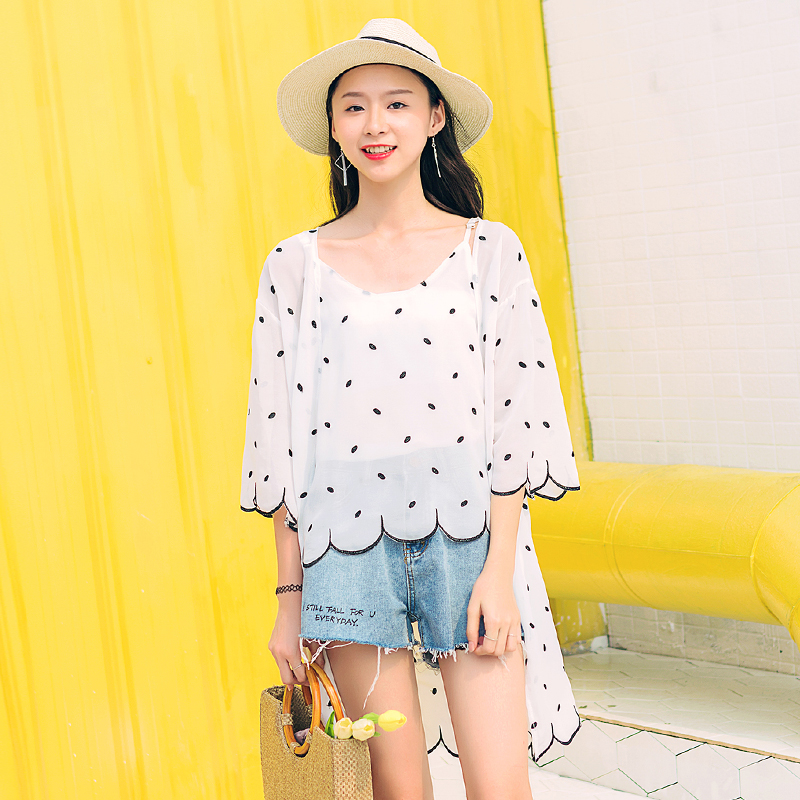 / 寬松波浪邊雪紡衫夏裝新款女裝韓版中長款波吊帶開衫兩件套潮