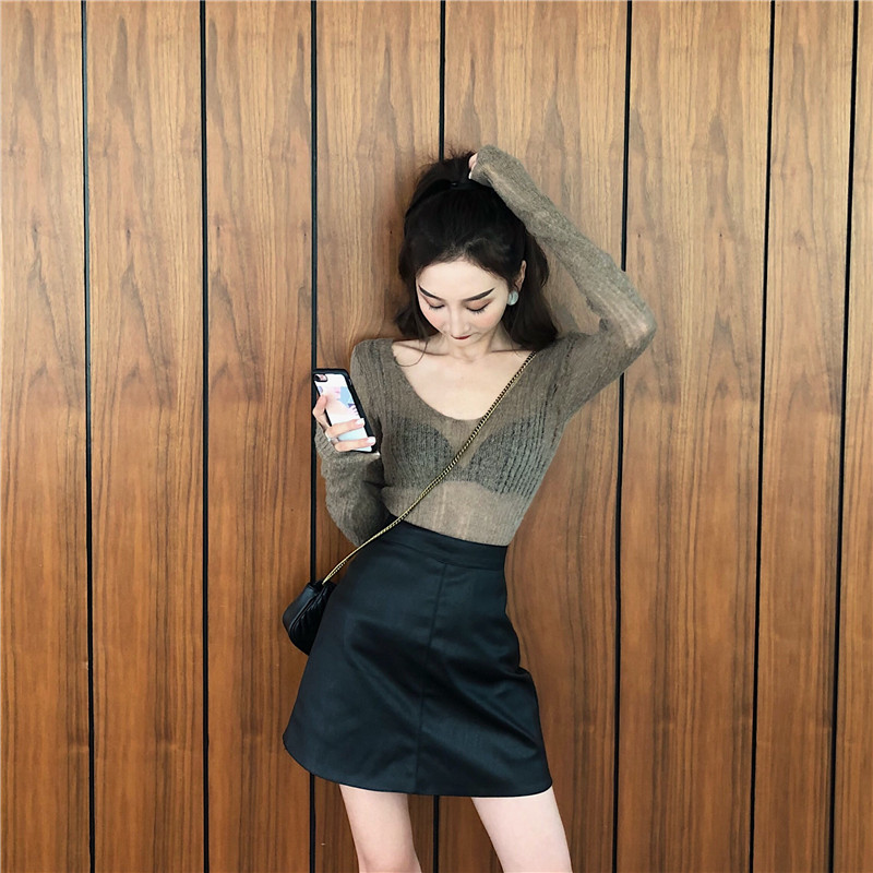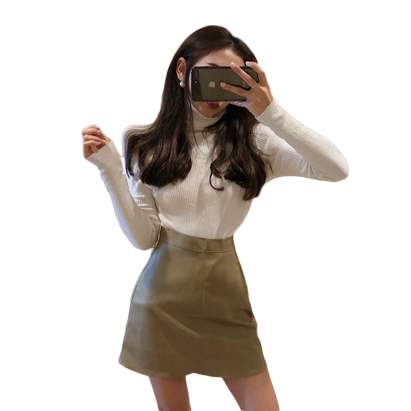 港味復古套裝高腰PU皮裙半身裙純色時尚短裙a字裙包臀裙+氣質襯衫