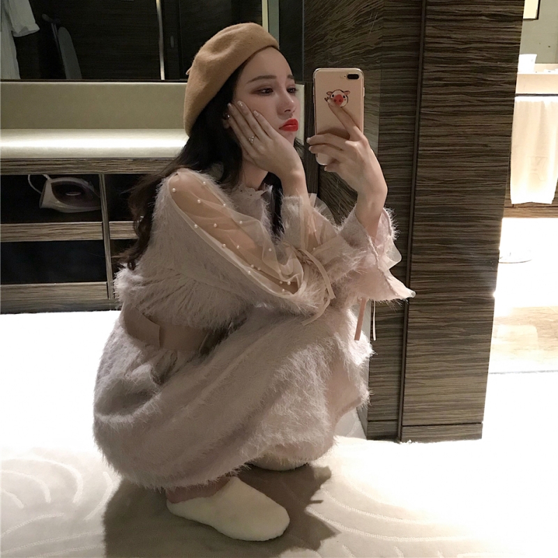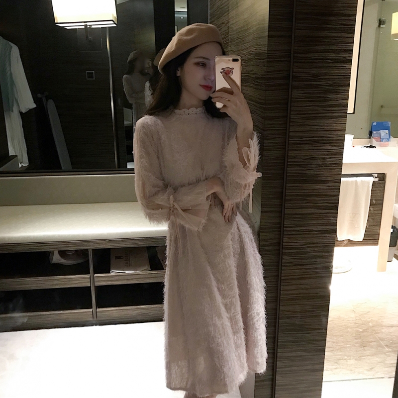 / 2018秋冬新款時尚花邊立領百搭中長款高腰蝴蝶結長袖毛毛連衣裙女