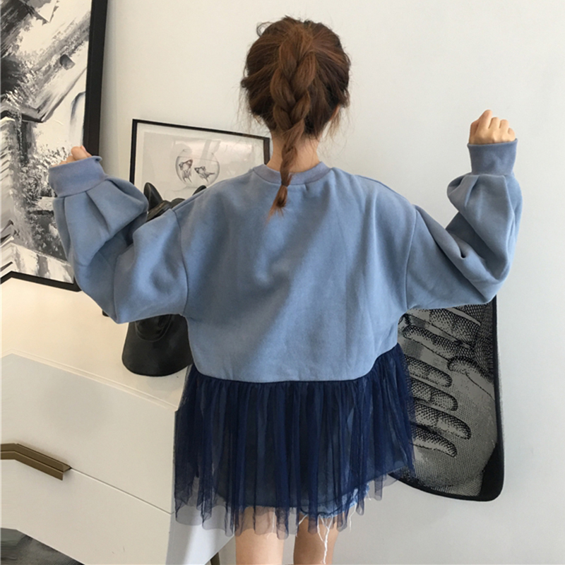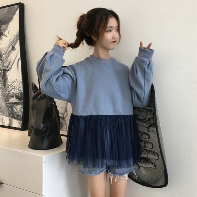 個性網紗拼接假兩件上衣秋裝女新款時尚寬松長袖衛衣圓領學生外套