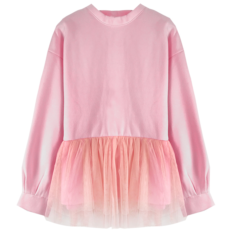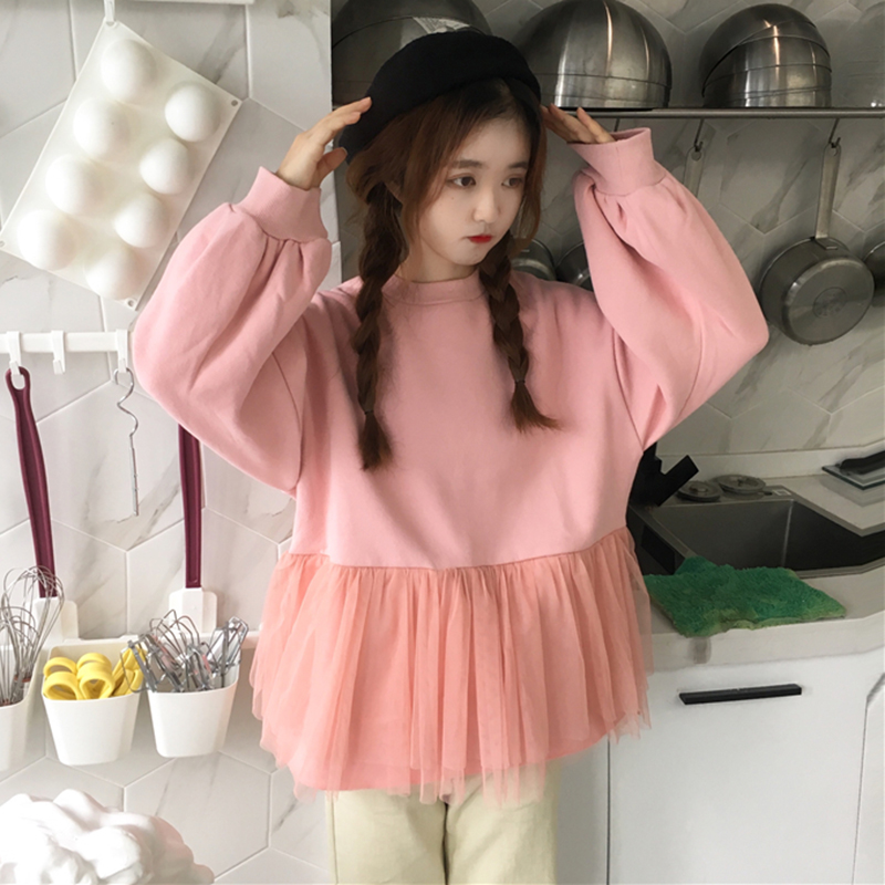 / 個性網紗拼接假兩件上衣秋裝女新款時尚寬松長袖衛衣圓領學生外套