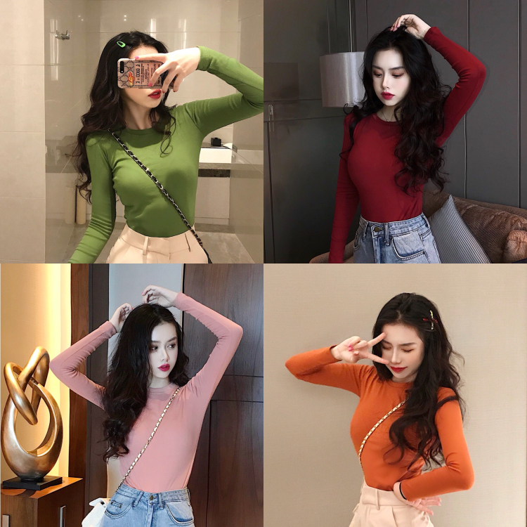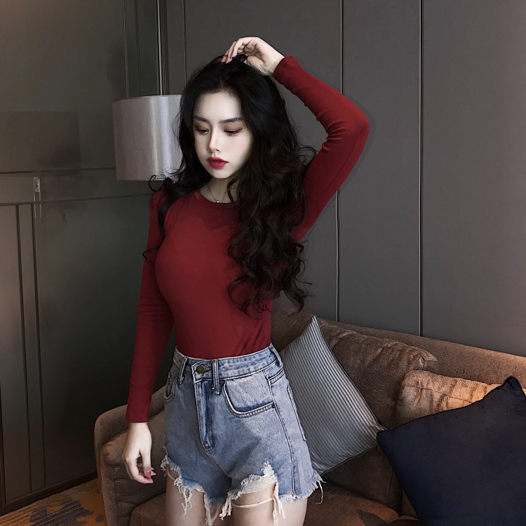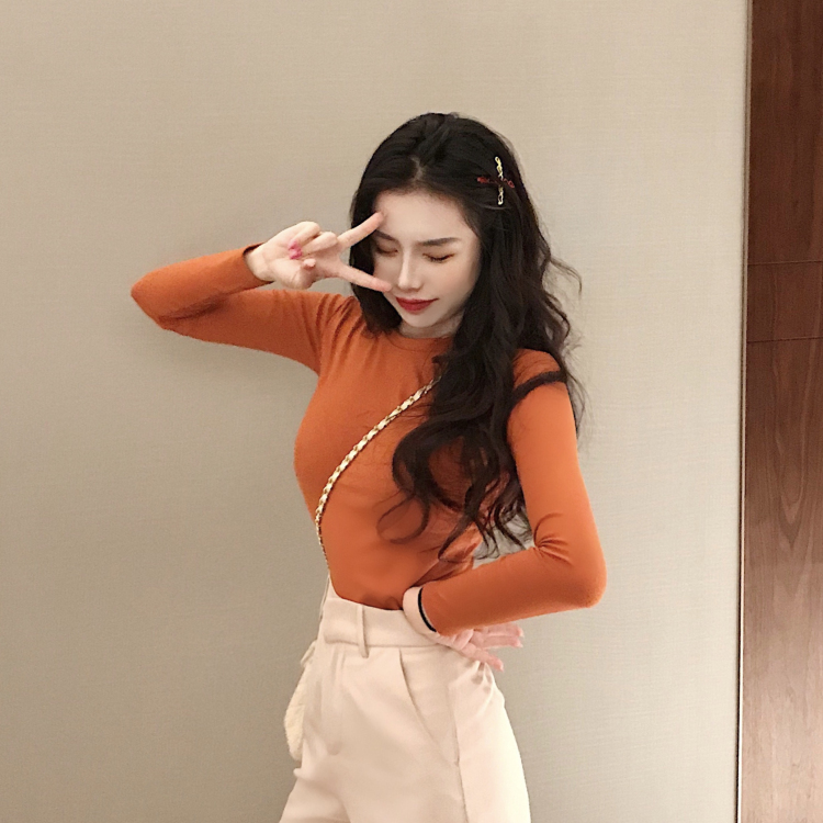 / chic早秋上衣女新款韓版復古百搭圓領修身打底高腰長袖磨毛T恤潮