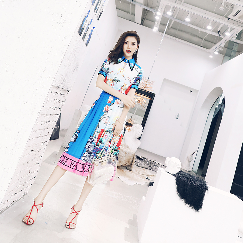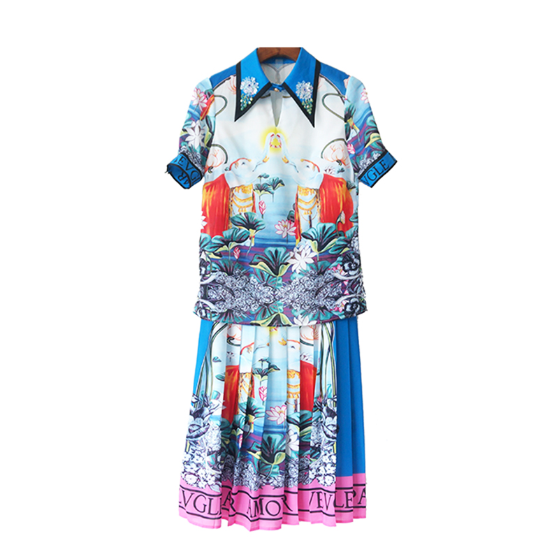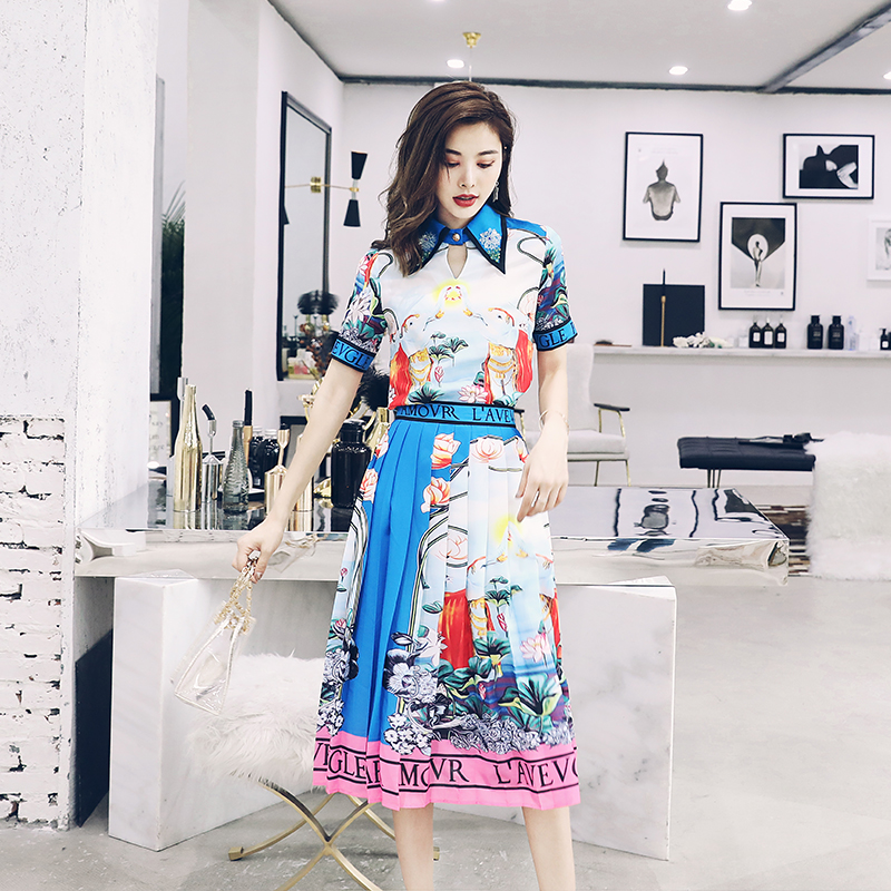 / S秀名媛氣質2018夏季新品女神范顯瘦百褶半身裙拼色印花兩件套裝