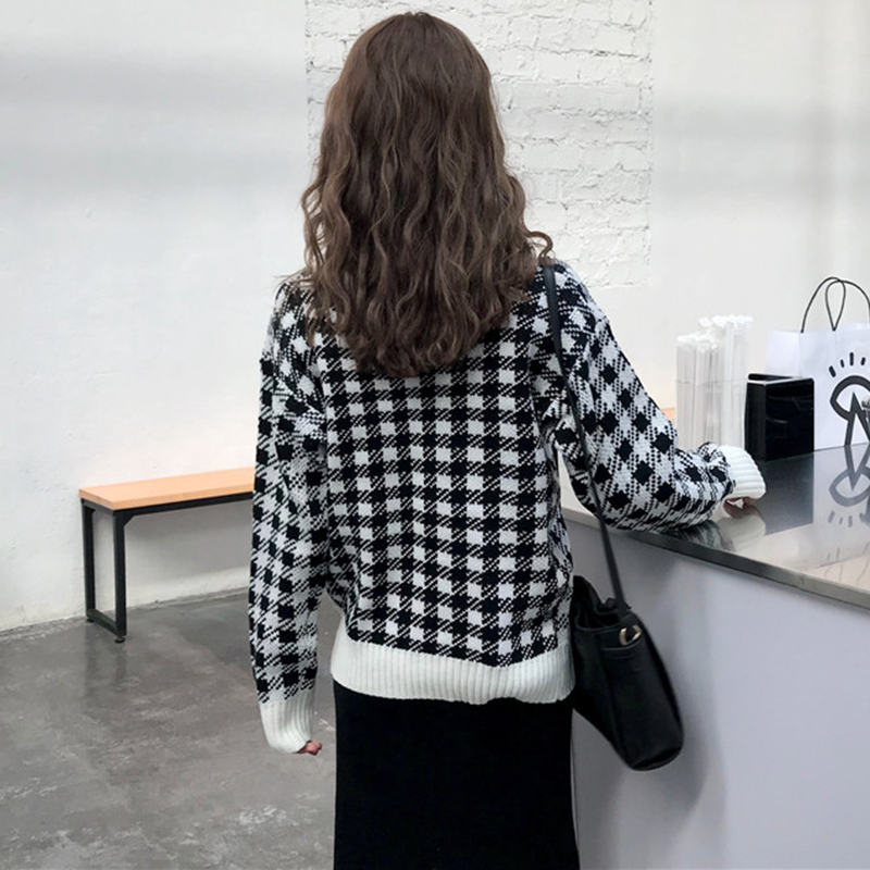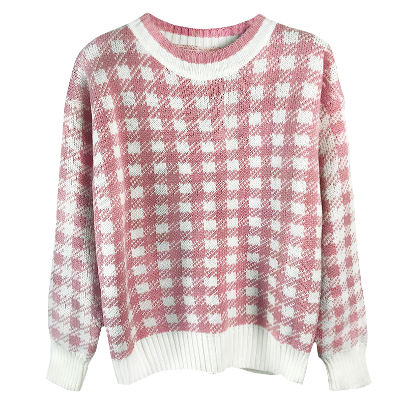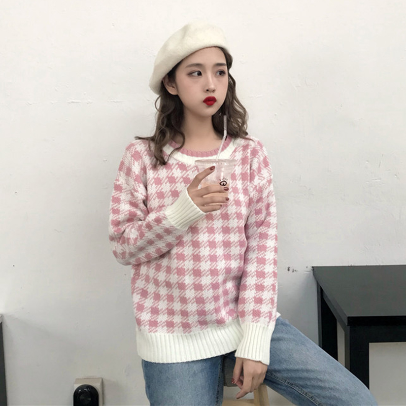 學院風慵懶套頭針織打底衫女寬松格子套頭毛衣秋裝新款長袖上衣潮