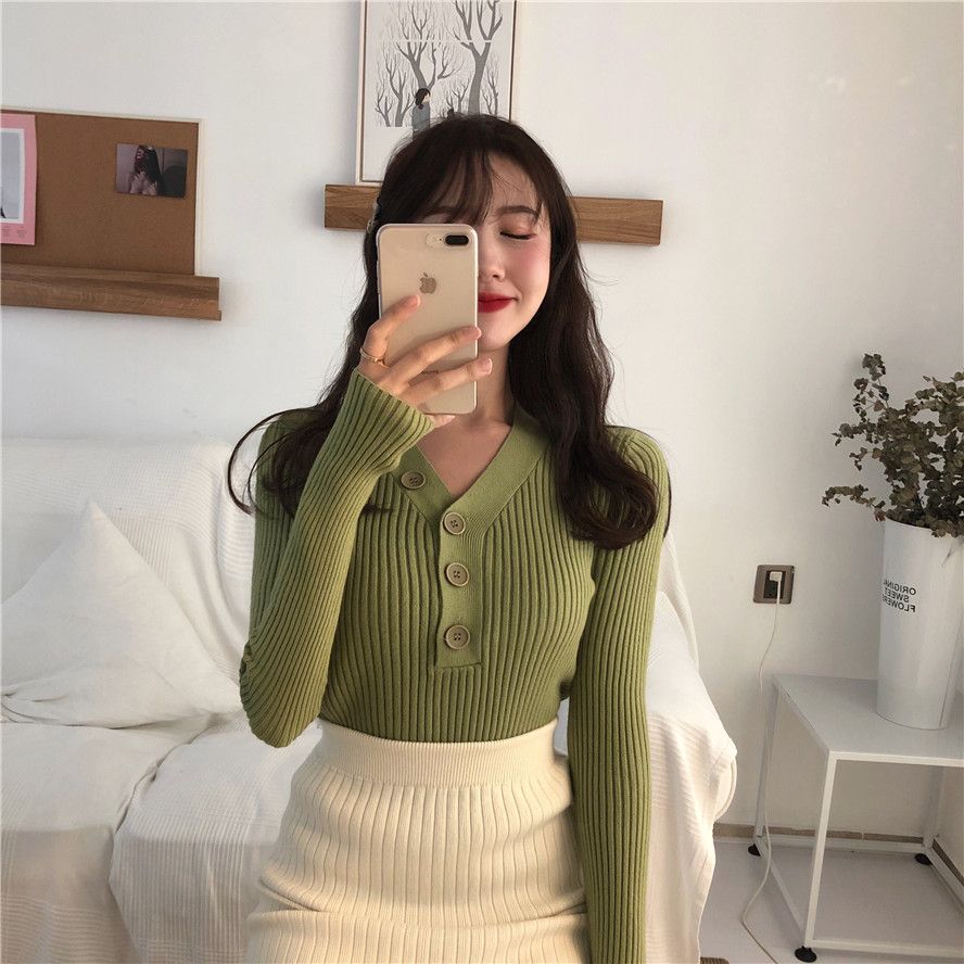 / 韓版氣質V領一排扣針織衫毛衣女2018新款秋冬長袖修身套頭打底衫