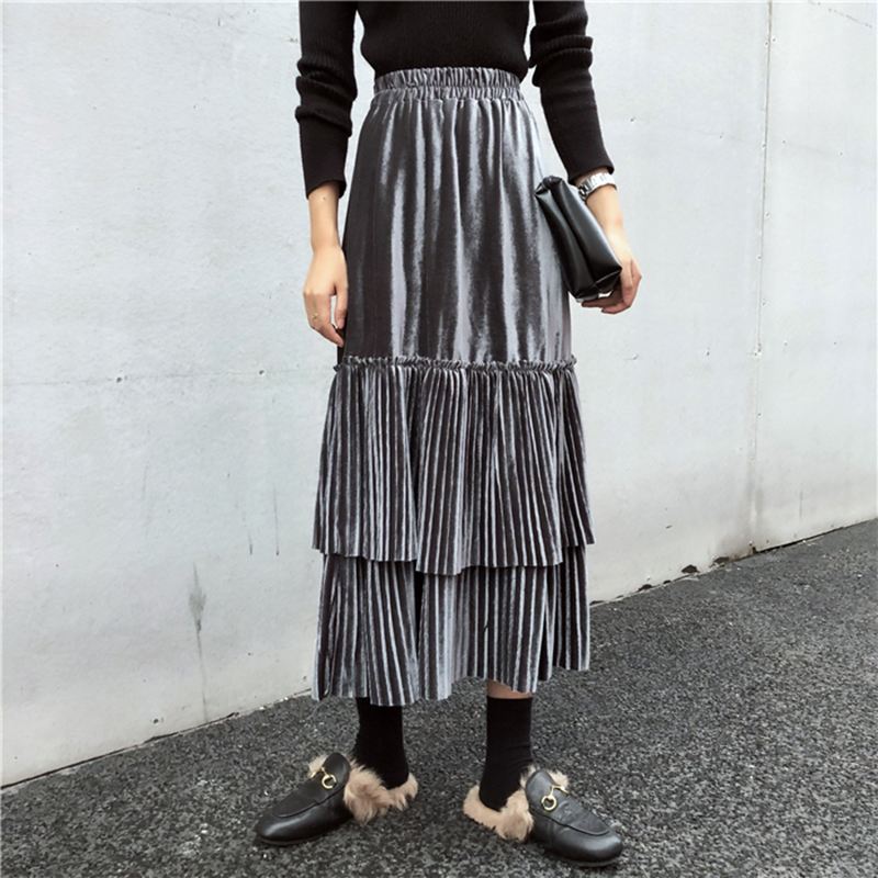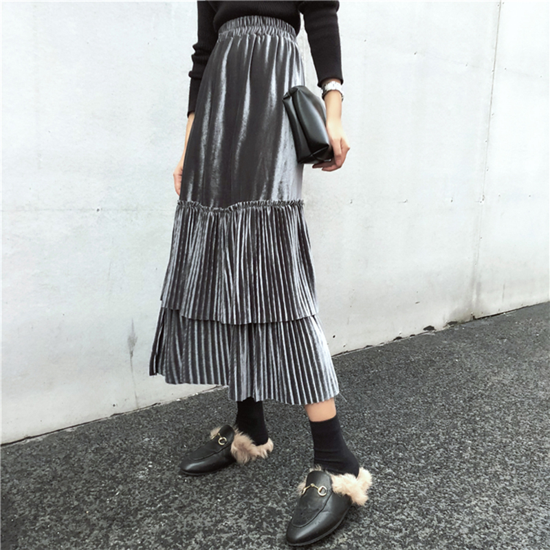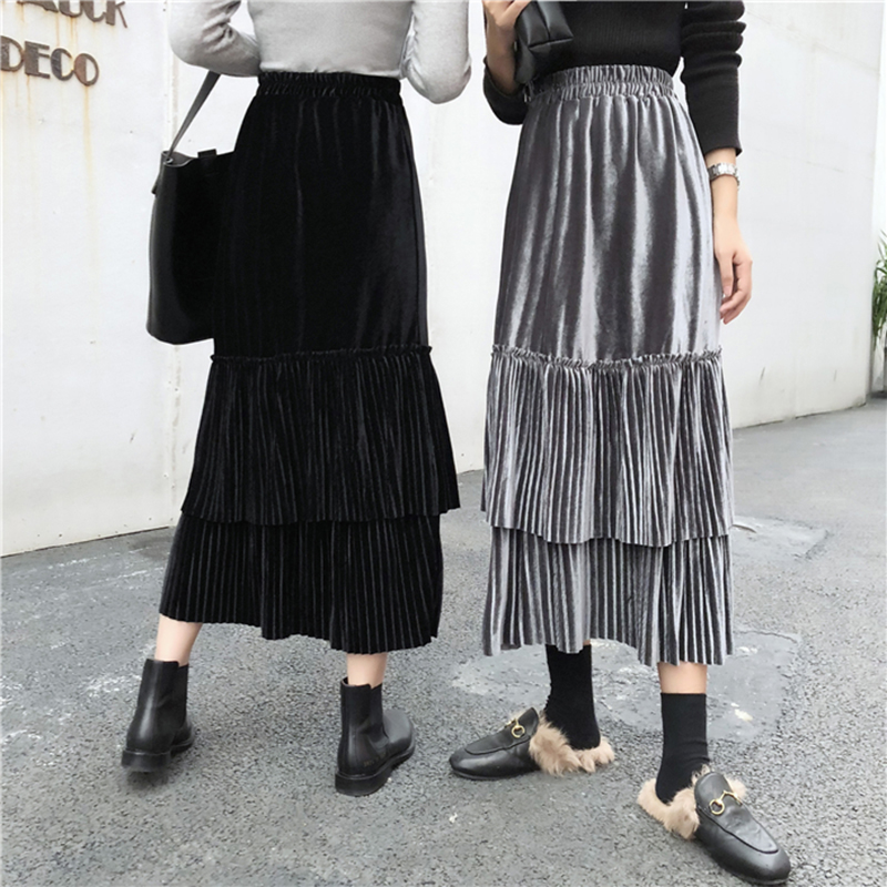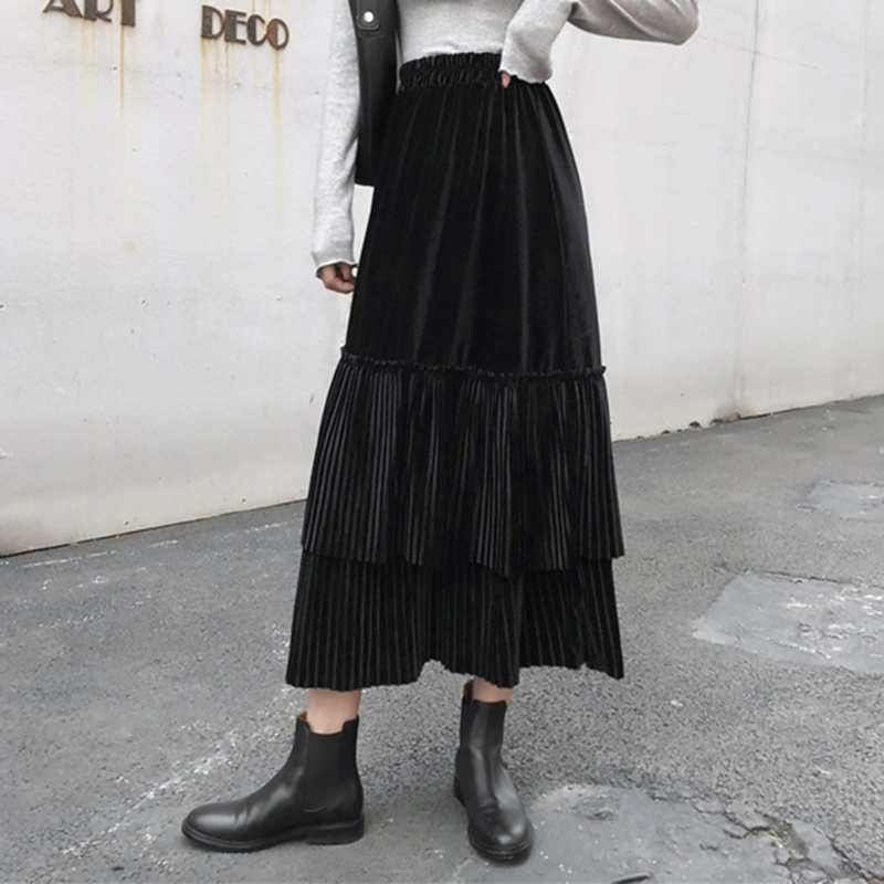 / 高腰顯瘦金絲絨百褶半身裙子女秋冬裝新款學生復古黑色A字大擺裙