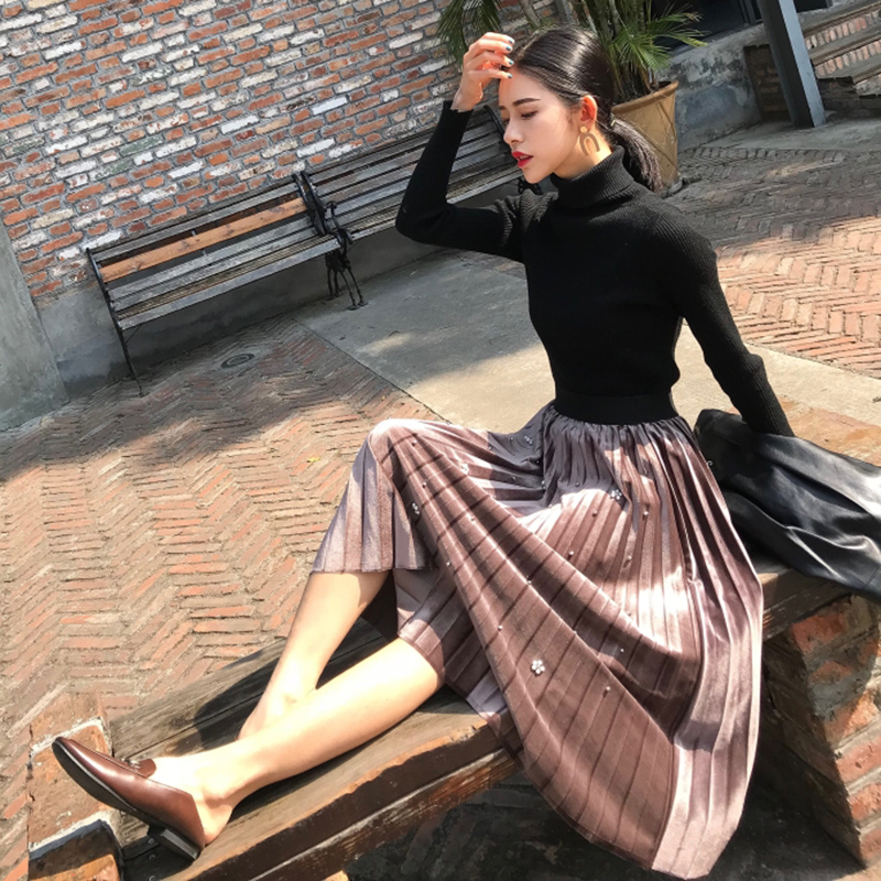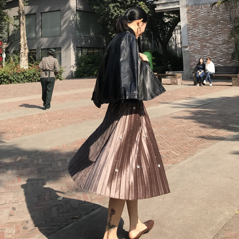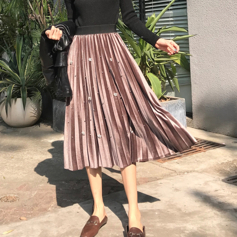 復古絲絨百褶大擺半身裙秋冬2018新款釘珠高腰顯瘦女A字中長裙子