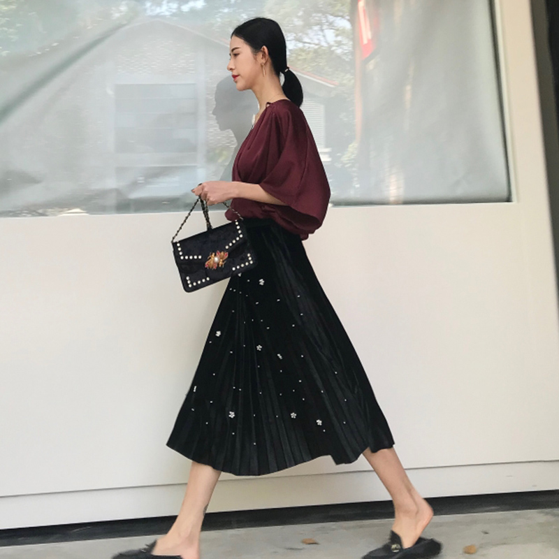 / 復古絲絨百褶大擺半身裙秋冬2018新款釘珠高腰顯瘦女A字中長裙子
