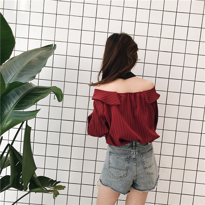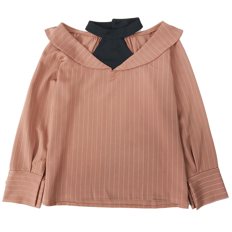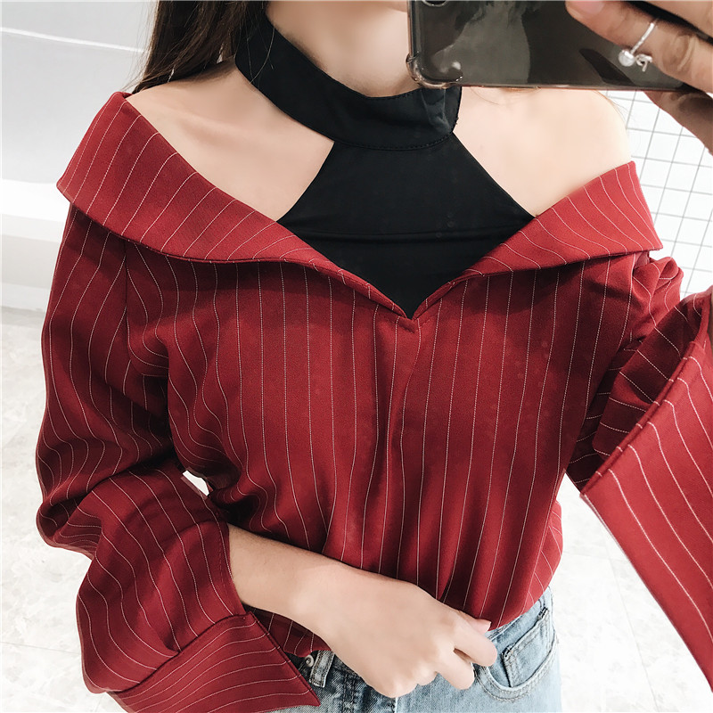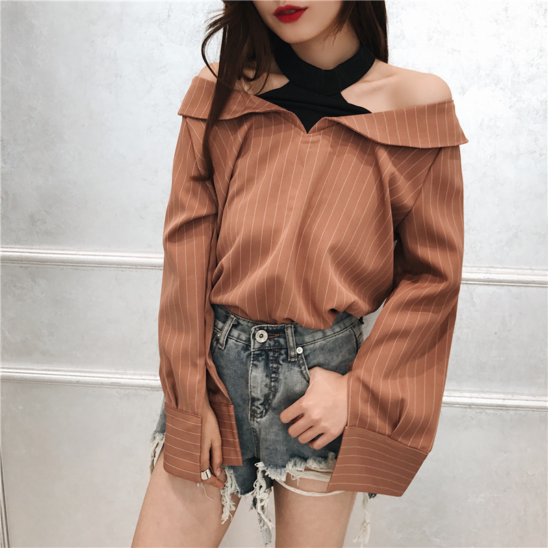 / 春裝新款女裝韓版寬松V領拼接掛脖假兩件上衣女學生露肩條紋襯衫
