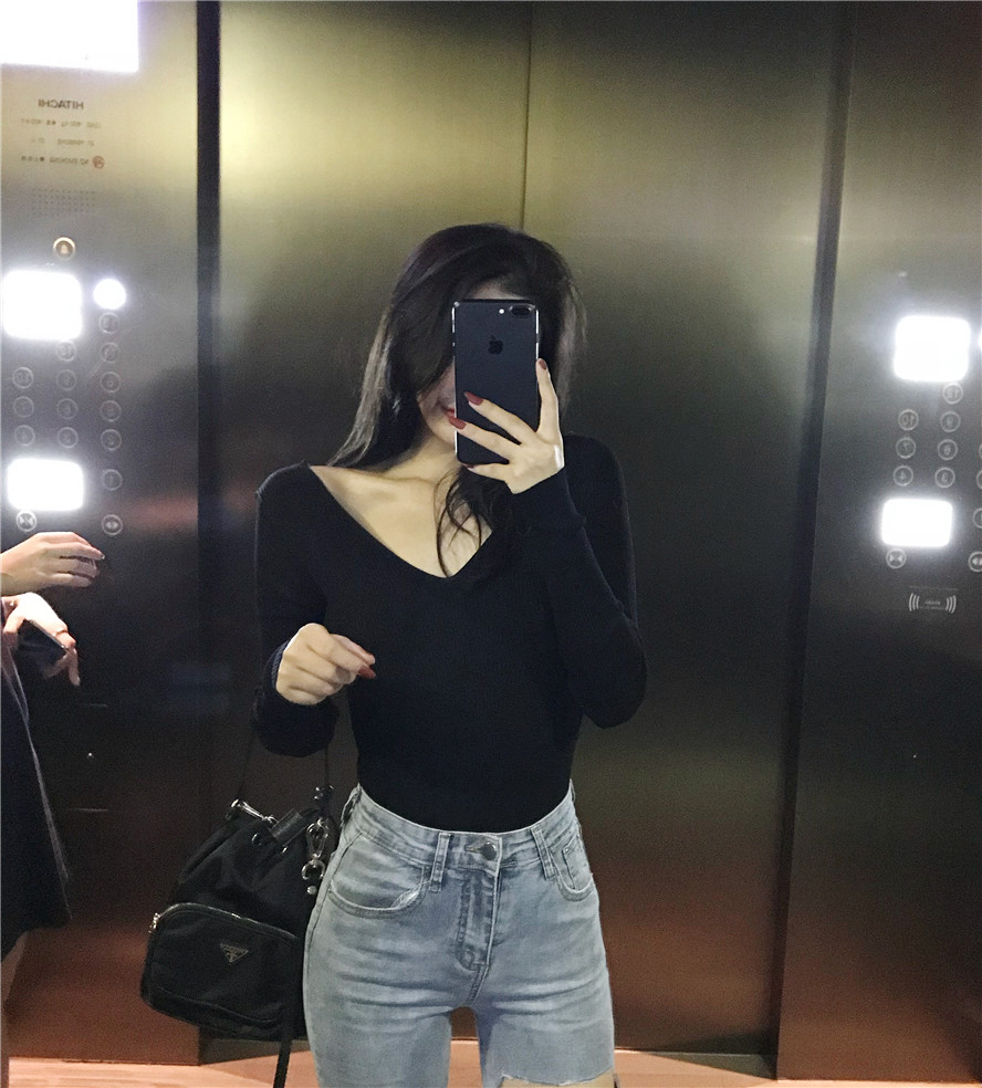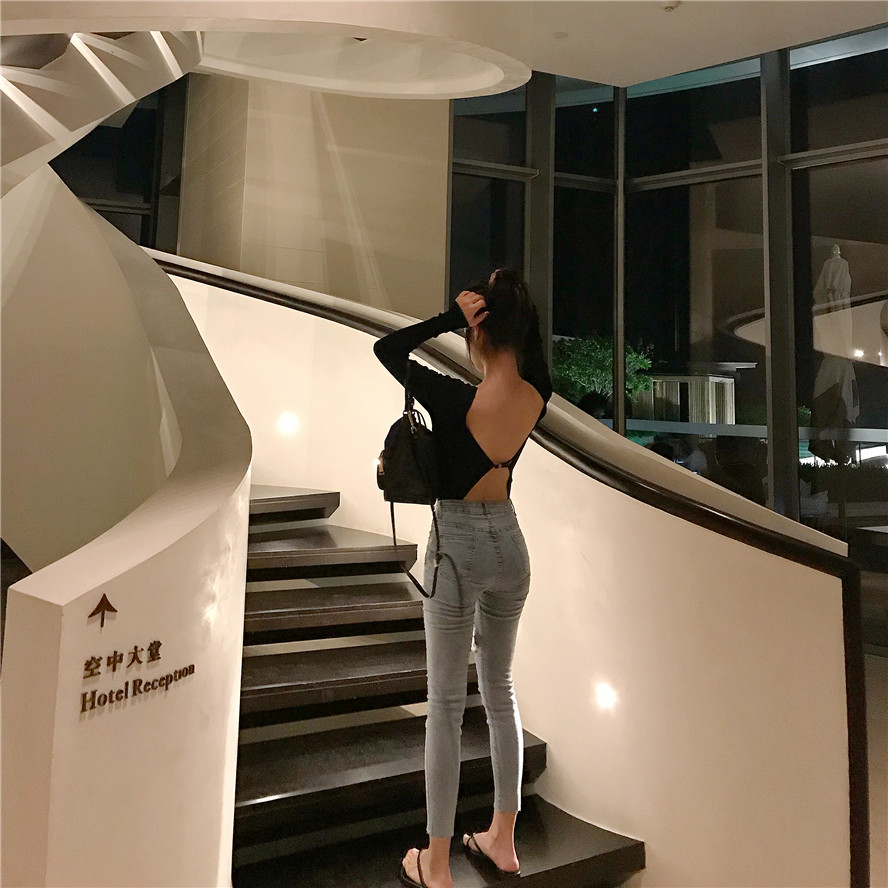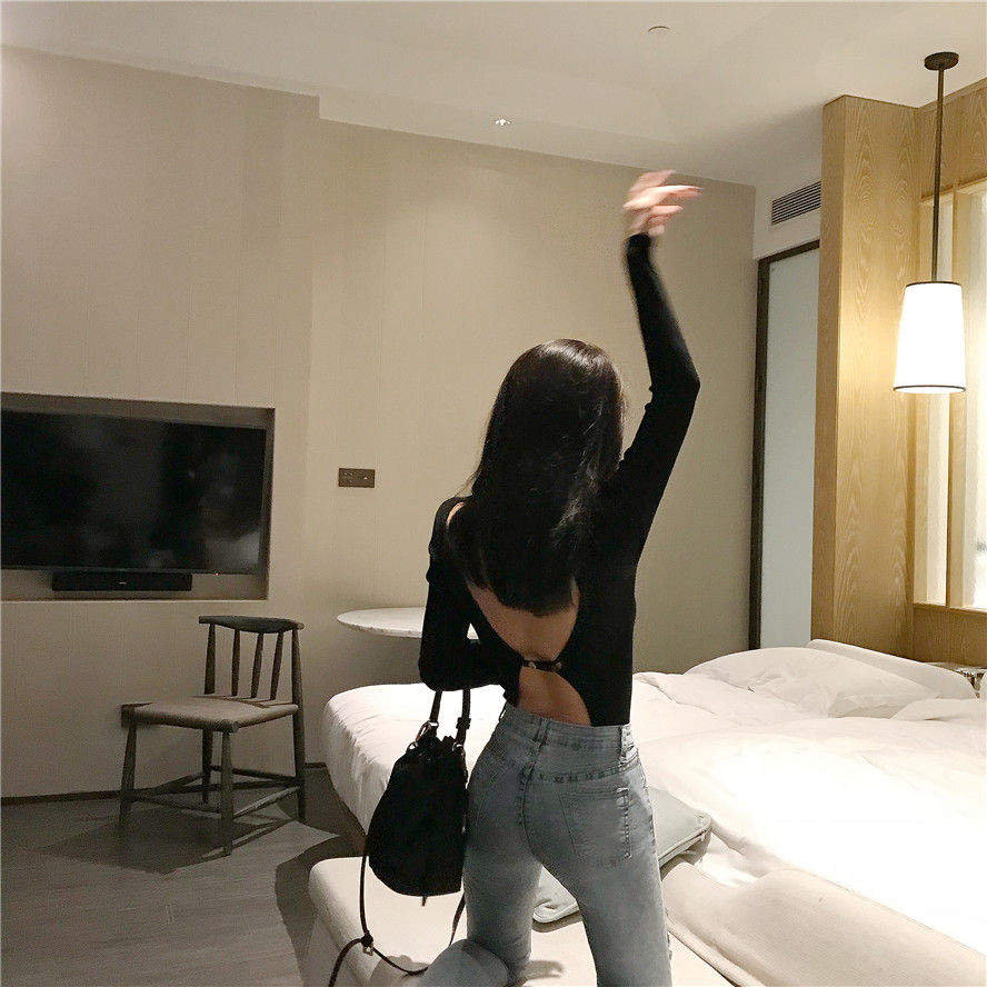 2018新款女秋季露背長袖打底t恤小心機性感針織衫復古風百搭上衣