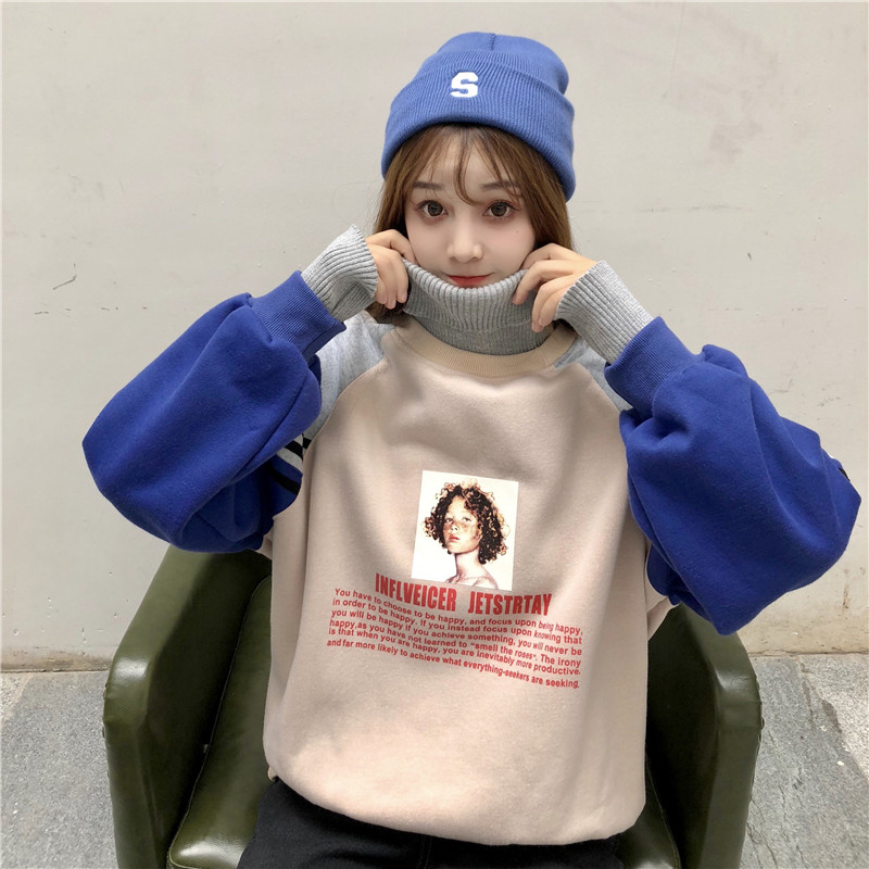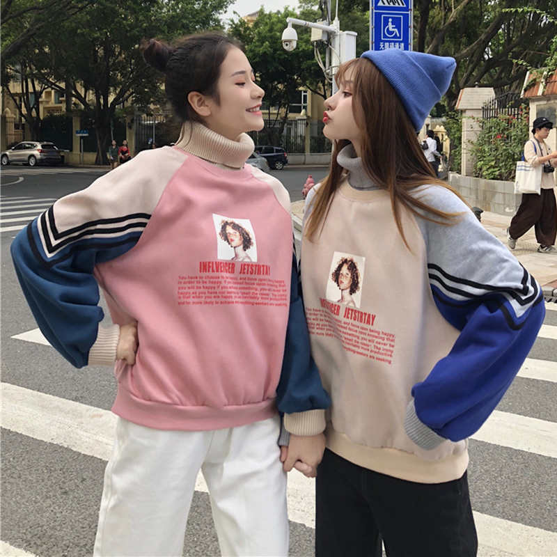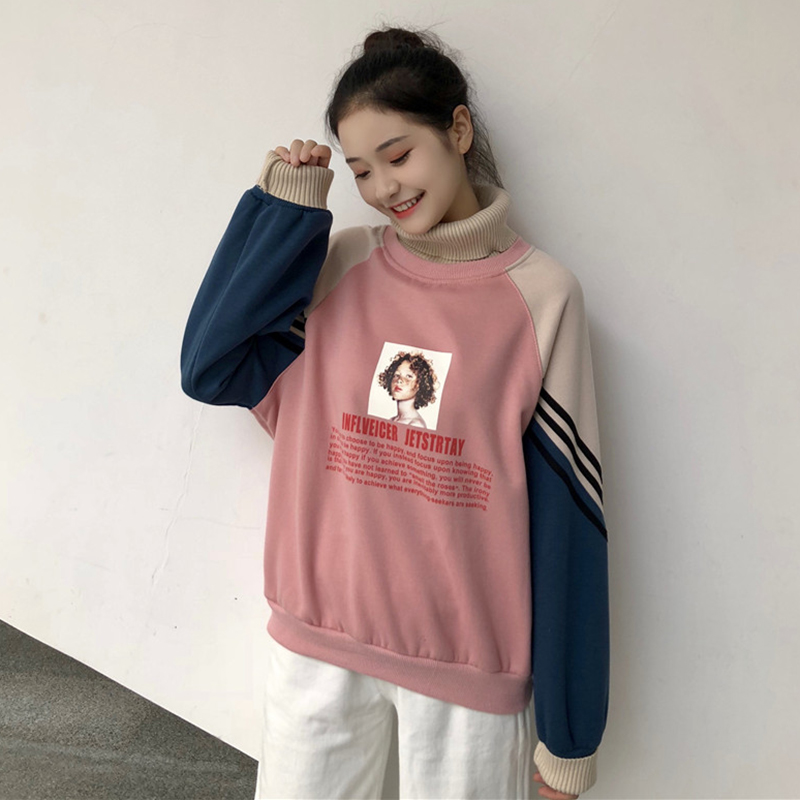 / 韓版秋冬女裝2018新款拼接高領撞色加絨衛衣學生寬松百搭字母外套