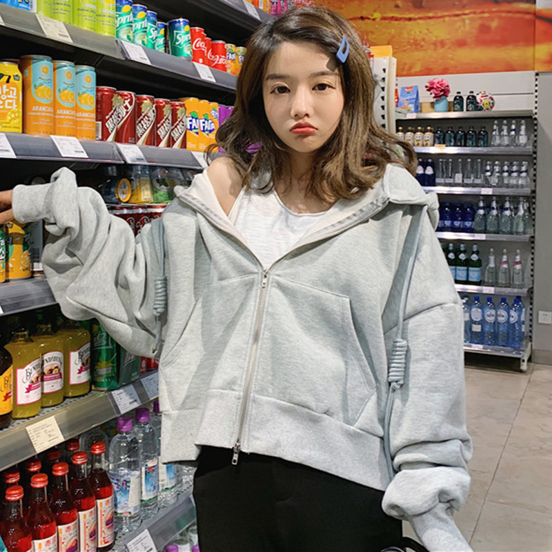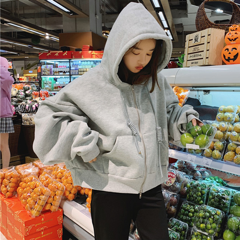 寬松連帽加絨衛衣2018新款女秋冬裝港風長袖開衫上衣慵懶黑色外套
