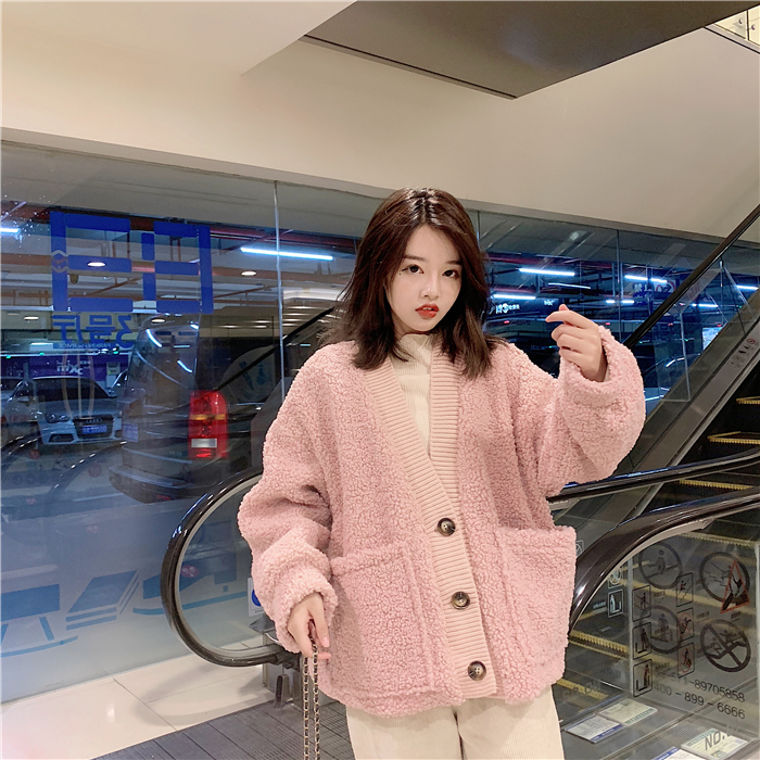 / 外套秋女2018新款加厚保暖V領單排扣口袋長袖寬松百搭羊羔毛大衣