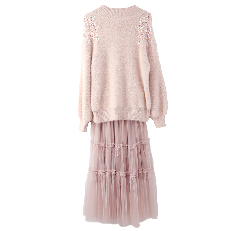 秋冬款套裝女2018新款針織上衣網紗半身裙兩件套淑女氣質中長款