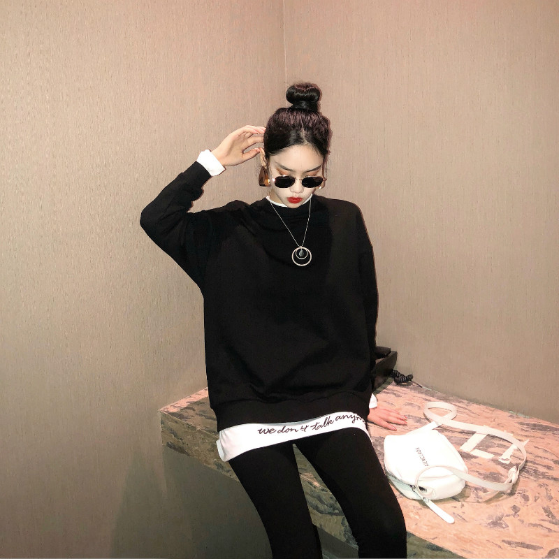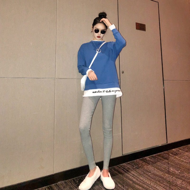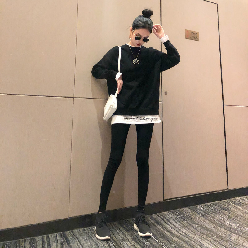 / 韓國復古風寬松顯瘦字母印花假兩件衛衣時尚套裝百搭修身打底褲女