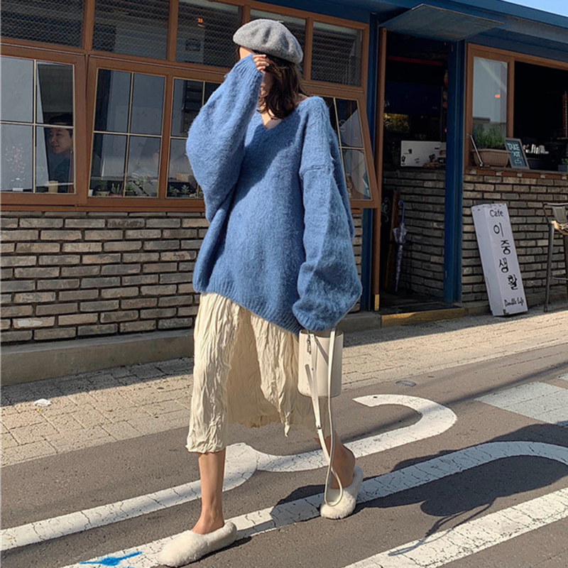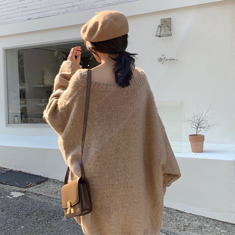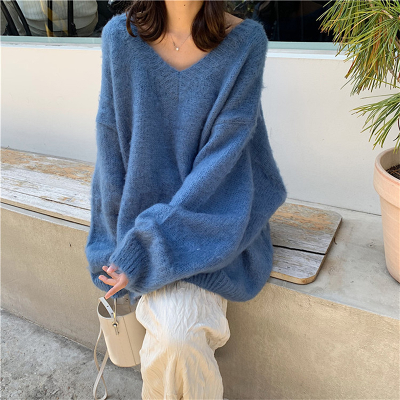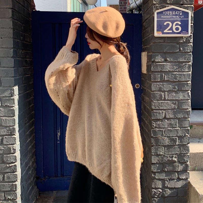 / 秋冬女裝2018新款時尚純色慵懶毛衣外套寬松燈籠袖V領針織衫上衣