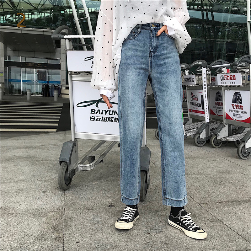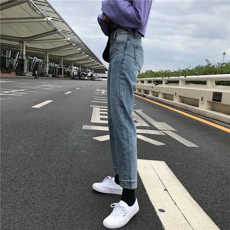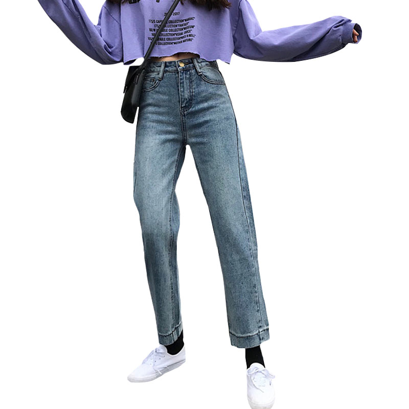 秋季女裝韓版高腰水洗做舊牛仔褲學生褲子寬松闊腿褲直筒褲九分褲