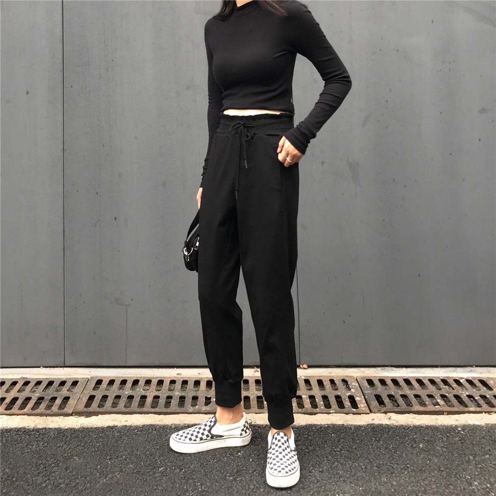 / 褲子女秋冬季新款復古百搭高腰顯瘦小腳九分褲哈倫褲系帶休閑衛褲