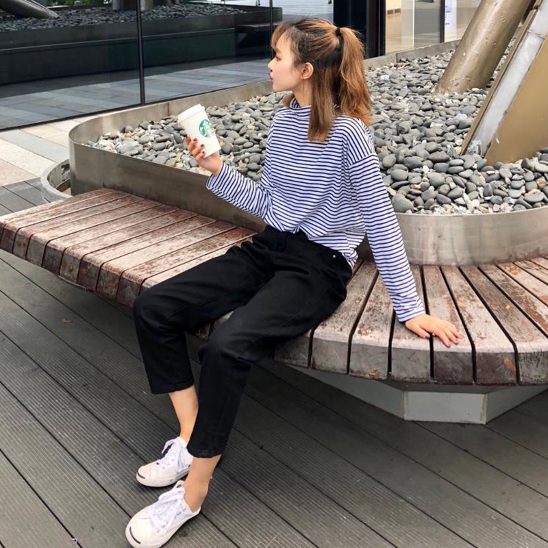 / 時尚條紋高領T恤秋裝女2018新款韓版學生休閑上衣百搭長袖打底衫