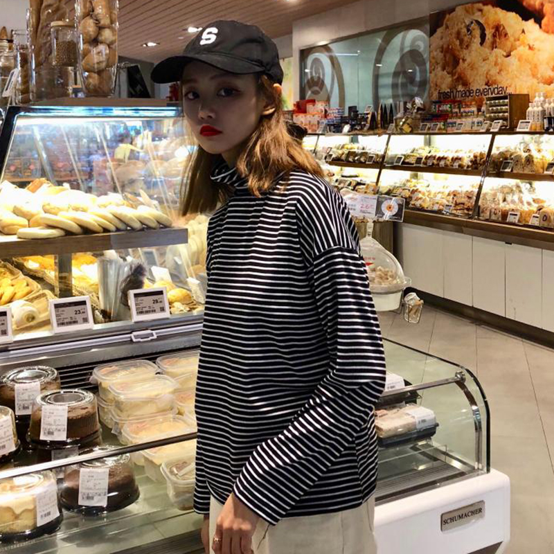 時尚條紋高領T恤秋裝女2018新款韓版學生休閑上衣百搭長袖打底衫