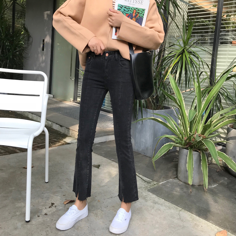 / 秋季韓版做舊彈力褲腳開叉黑色牛仔褲高腰修身顯瘦直筒褲九分褲女
