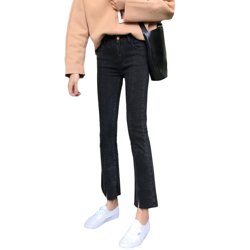 秋季韓版做舊彈力褲腳開叉黑色牛仔褲高腰修身顯瘦直筒褲九分褲女