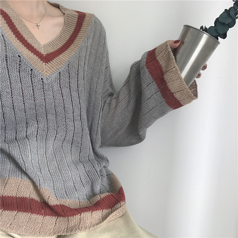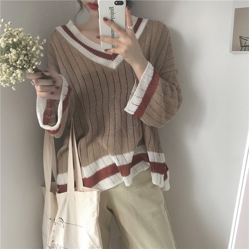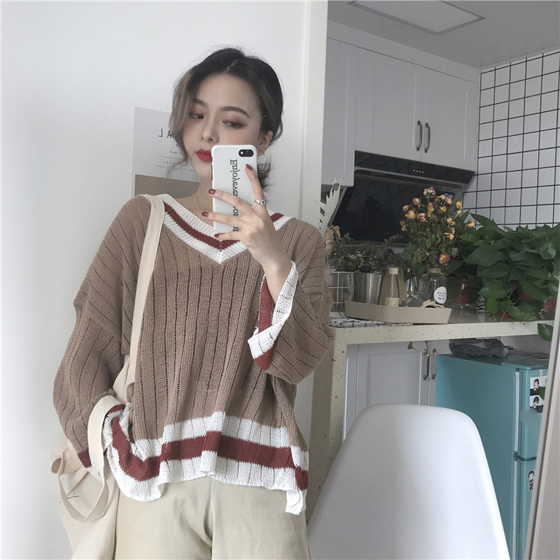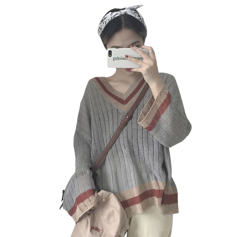 / 秋裝女裝韓版簡約撞色V領顯瘦長袖針織衫寬松毛衣罩衫上衣外套潮