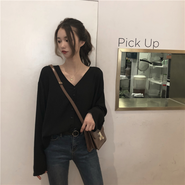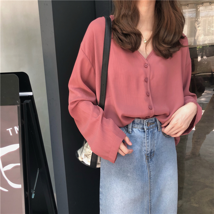 秋裝女裝韓版氣質純色寬松V領雪紡衫襯衣學生長袖休閑襯衫上衣潮