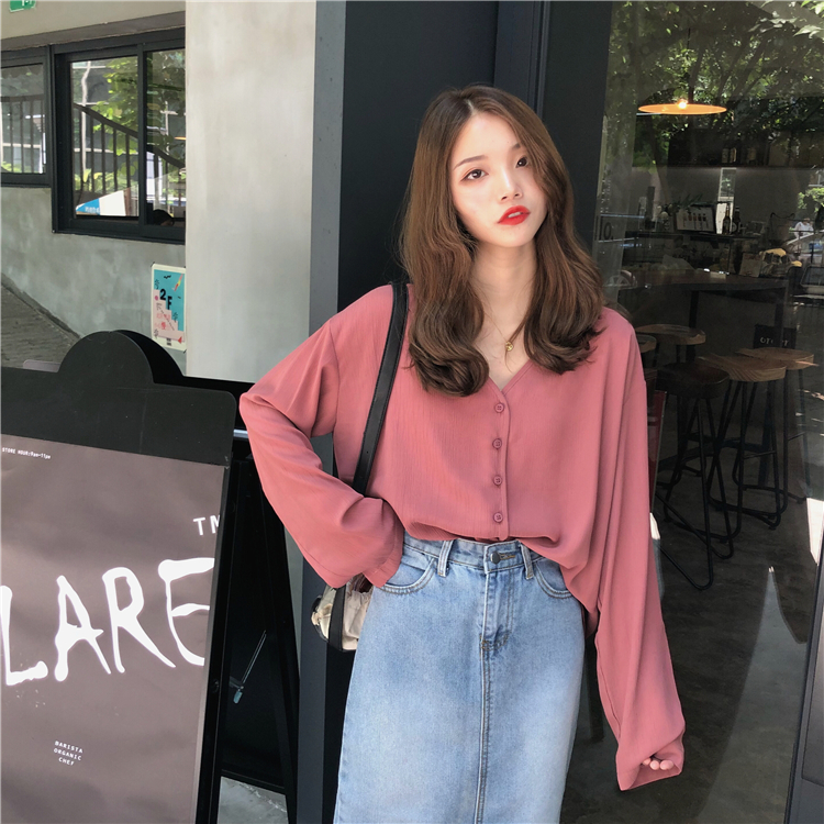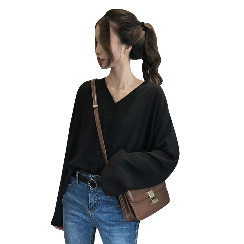 / 秋裝女裝韓版氣質純色寬松V領雪紡衫襯衣學生長袖休閑襯衫上衣潮