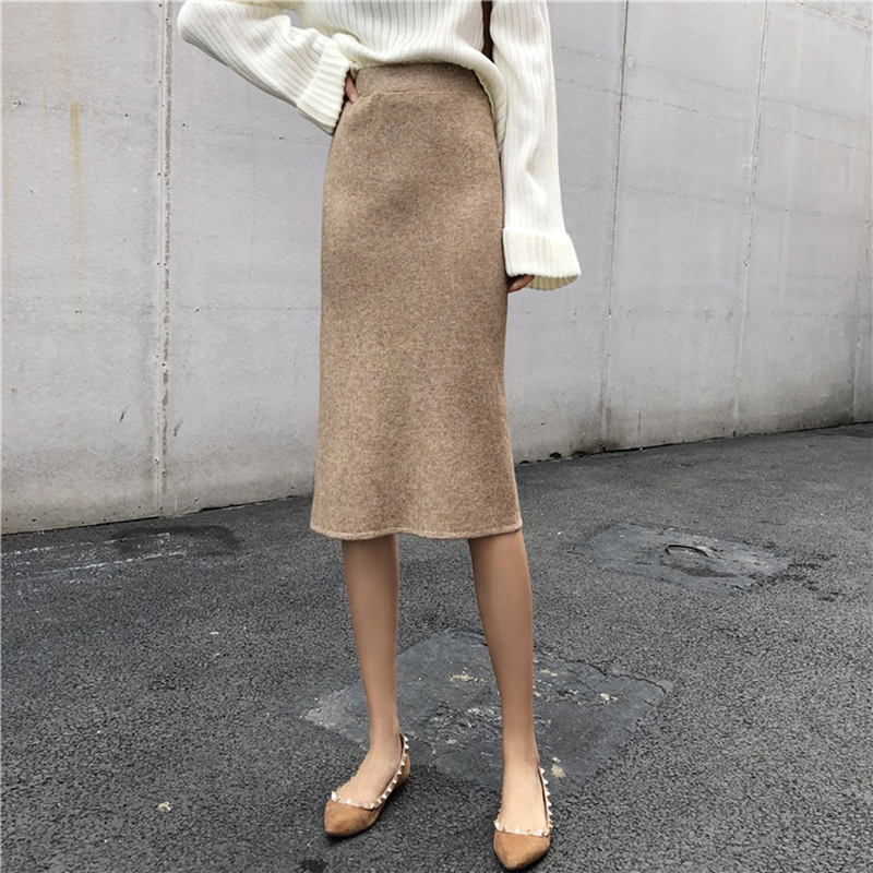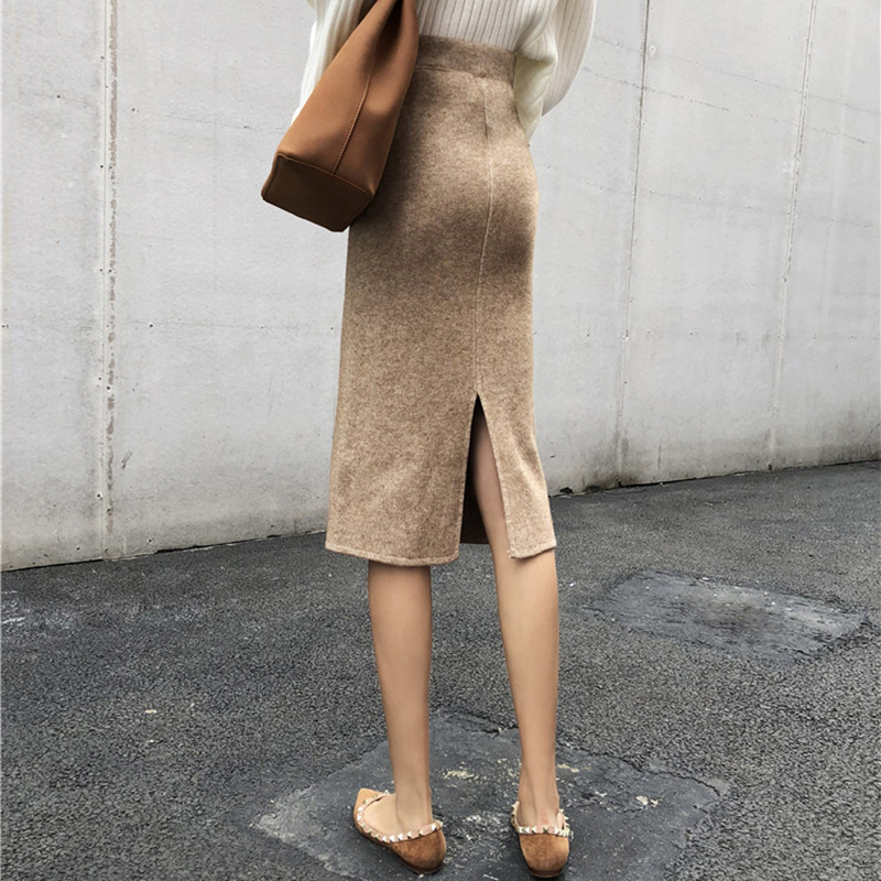 / 高腰顯瘦開叉針織半身裙子女秋冬裝新款學生復古風黑色包臀中長裙