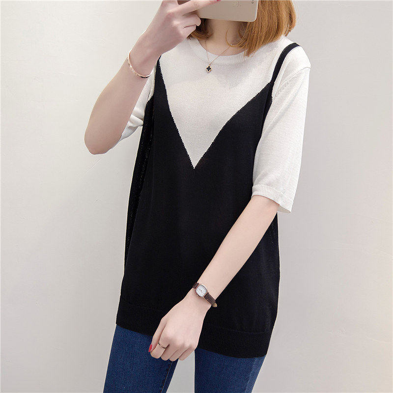 夏裝新款短袖t恤女韓版拼色假兩件短袖t恤女上衣打底衫體恤