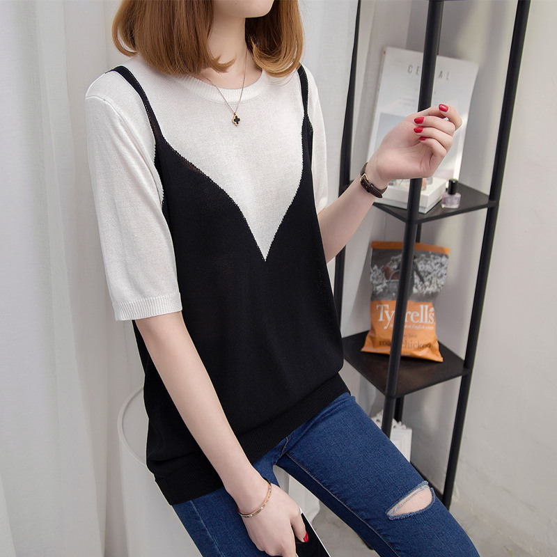 / 夏裝新款短袖t恤女韓版拼色假兩件短袖t恤女上衣打底衫體恤