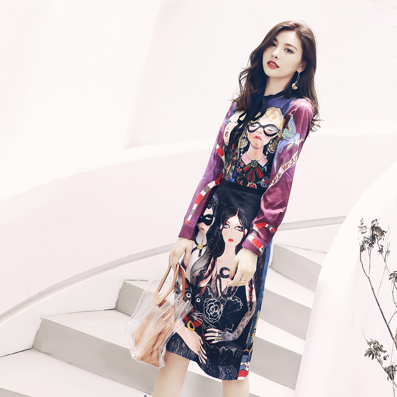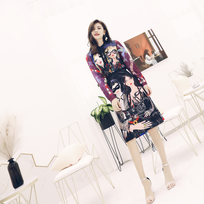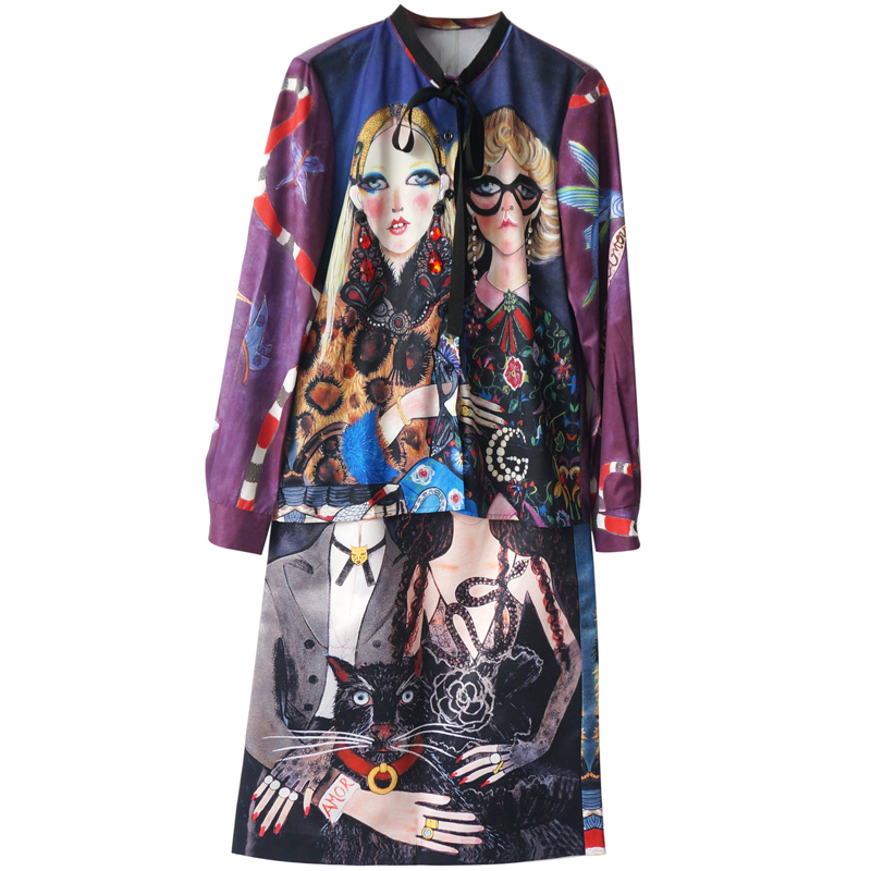 / 2018新款夏秋季女裝長袖襯衫復古印花半身裙兩件套裝名媛時尚套裝