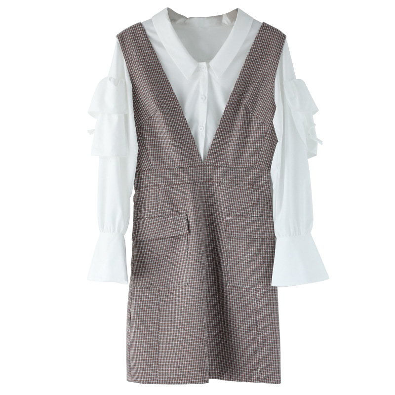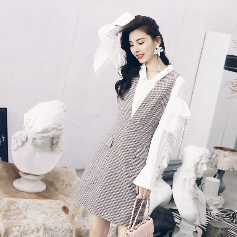 名媛復古背帶連衣裙女2018秋新品長袖上衣打底衫中長款裙子套裝
