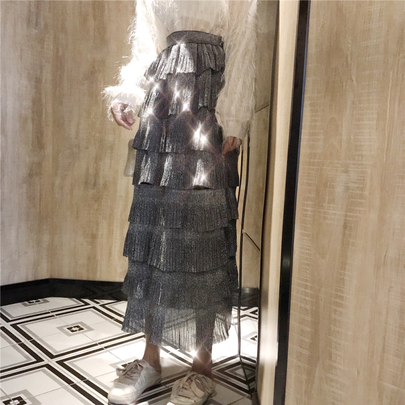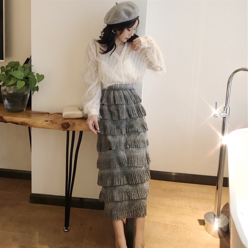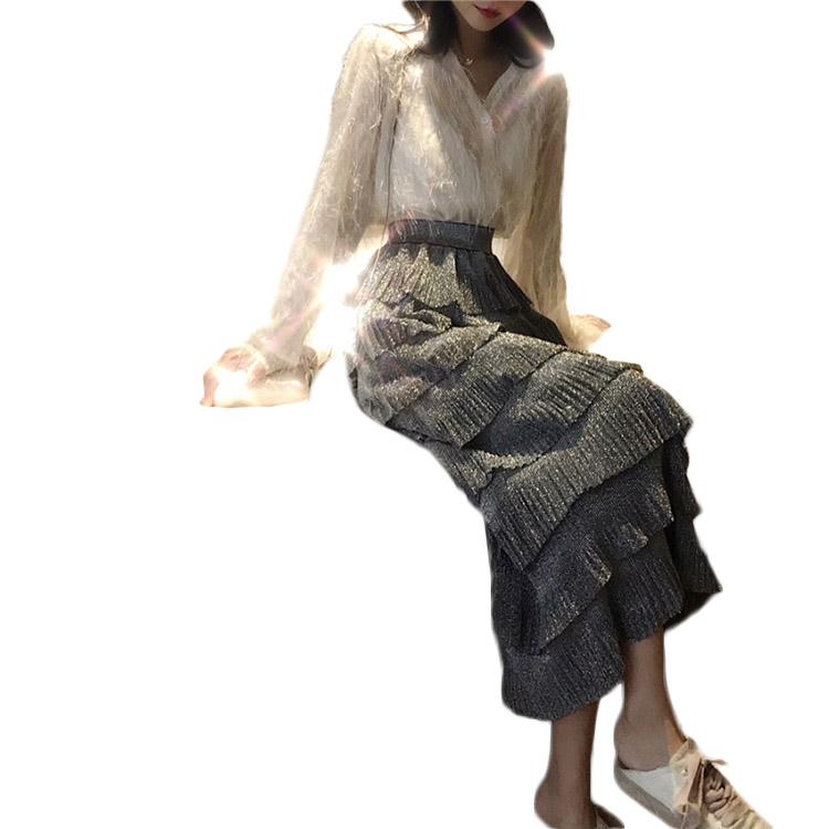 / 秋裝女2018新款套裝港味亮絲上衣+高腰閃閃亮絲半身裙時尚兩件套