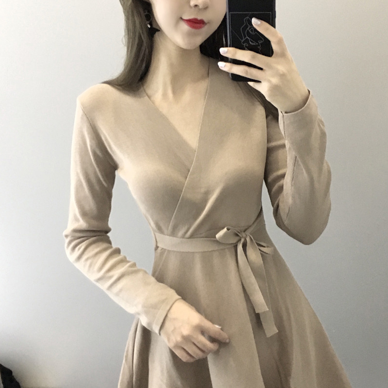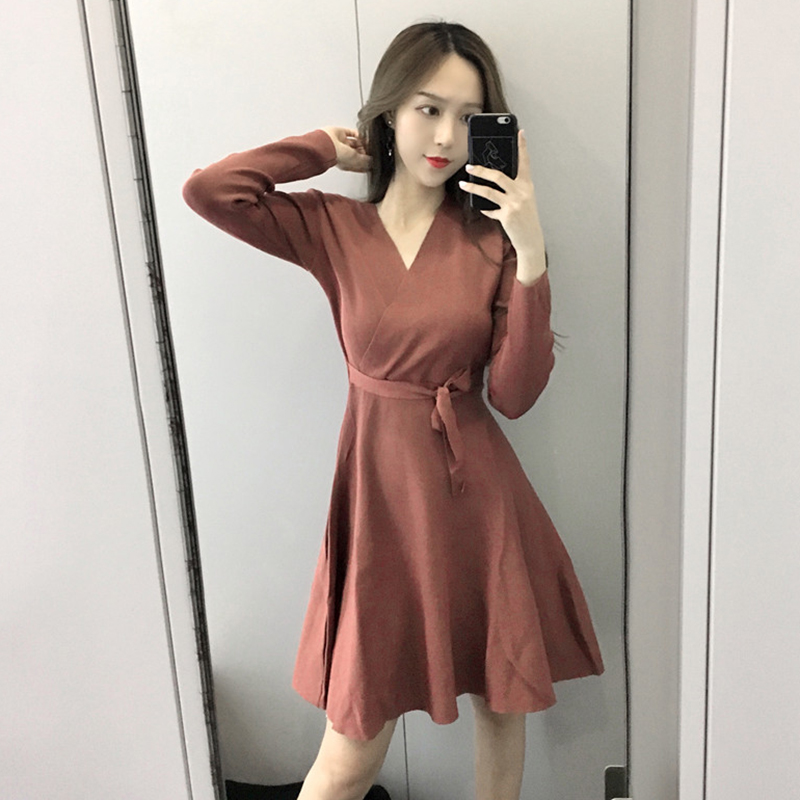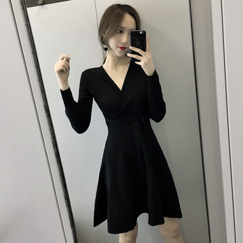 復古小黑裙秋裝女2018新款仙氣質長袖連衣裙修身收腰系帶A字裙子
