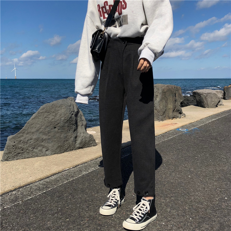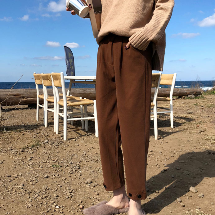 chic秋冬季2018新款褲子松緊腰褲腳紐扣抽褶毛呢九分休閑直筒褲女