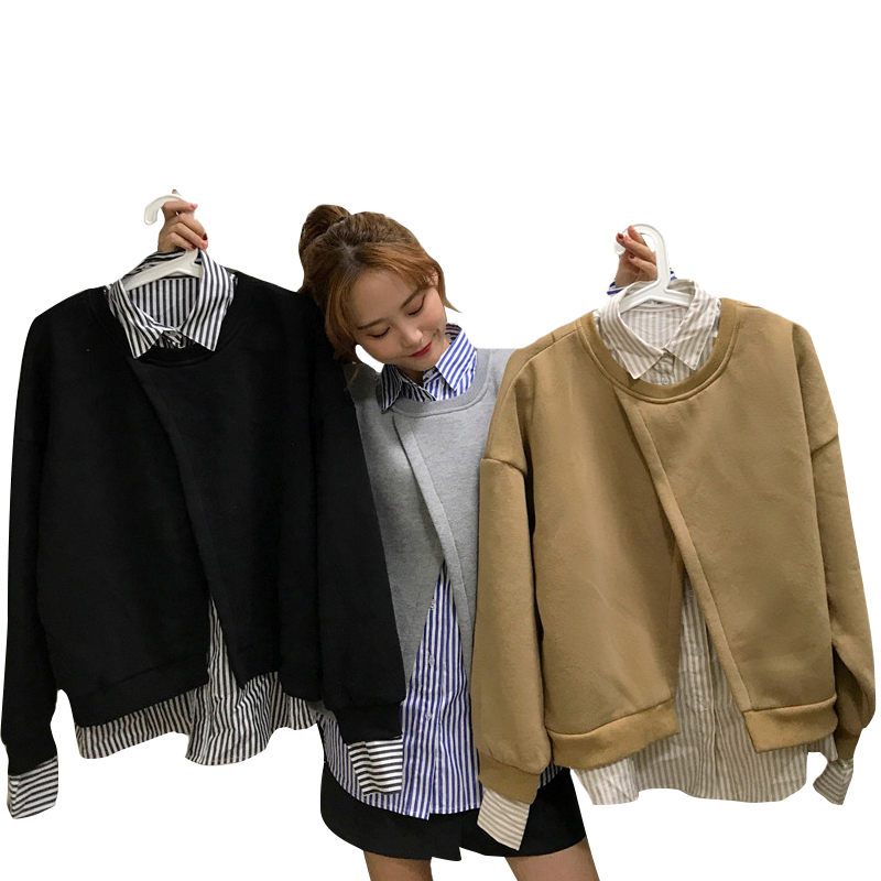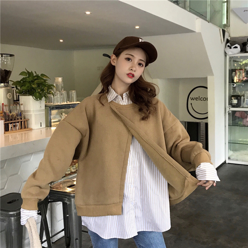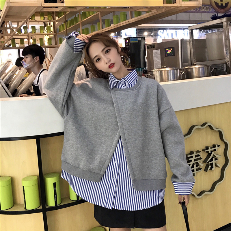/ 2018新款秋冬韓版中長款復古寬松拼接襯衫加厚套頭衛衣上衣外套女