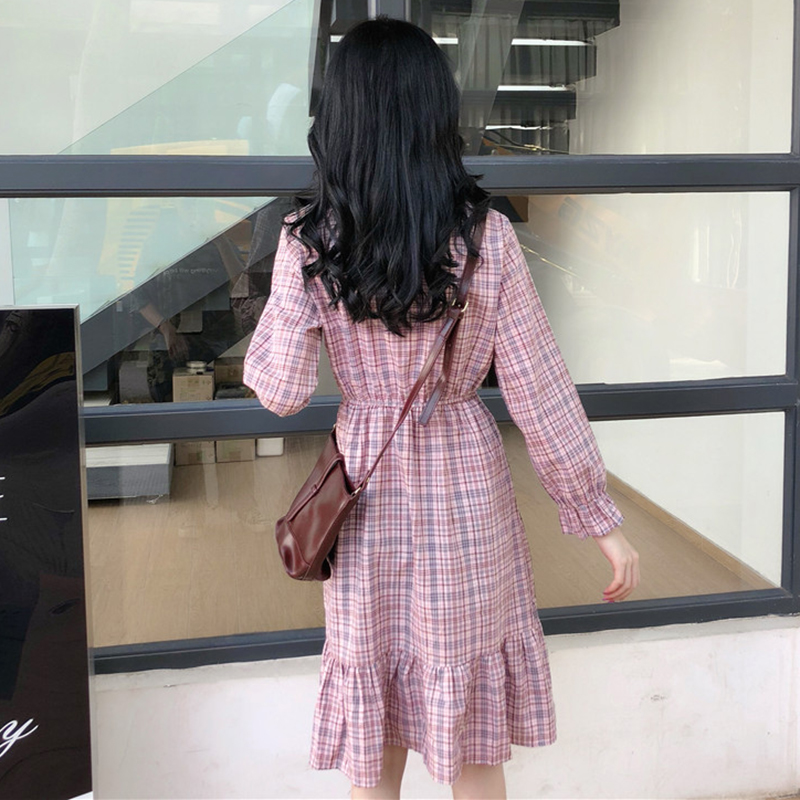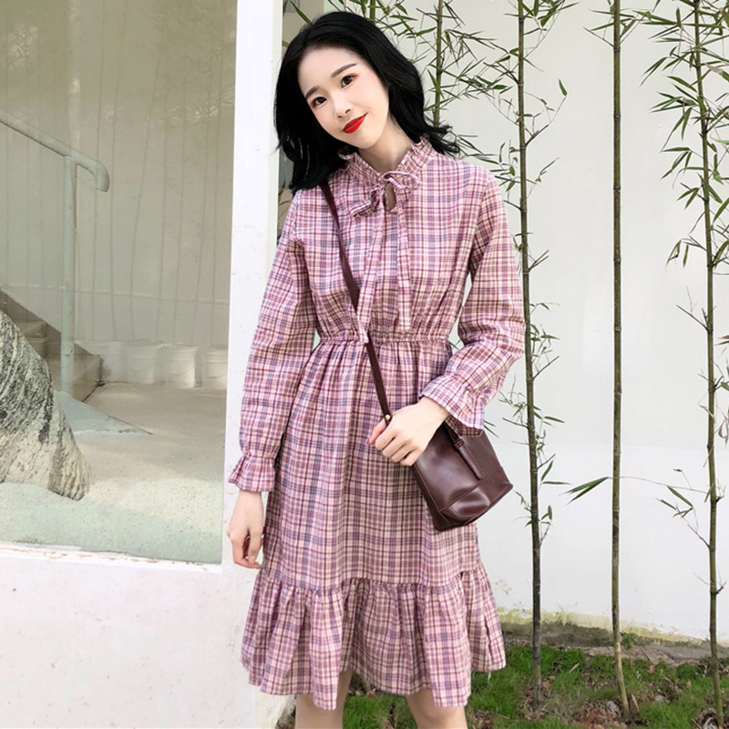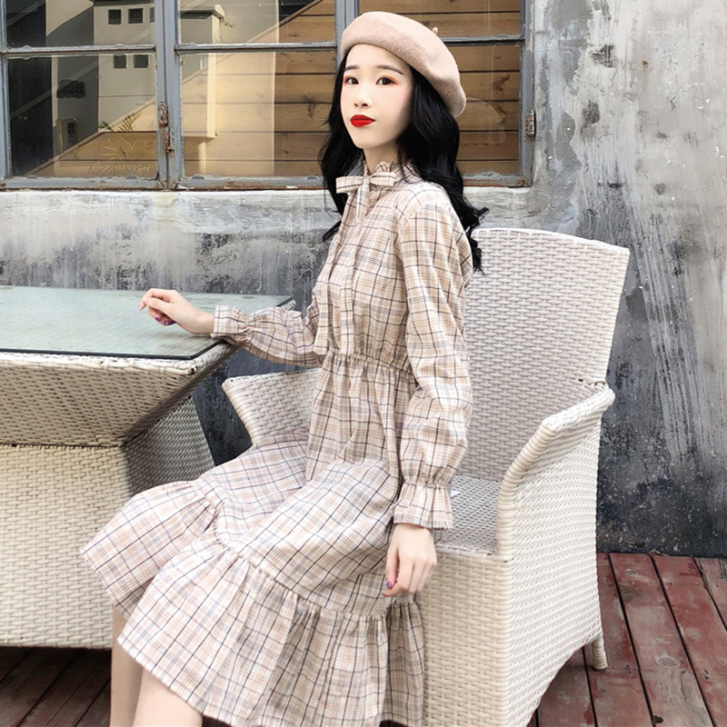 / 復古格子連衣裙秋裝女新款修身收腰荷葉邊中長裙系帶喇叭袖A字裙