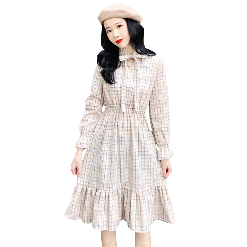 復古格子連衣裙秋裝女新款修身收腰荷葉邊中長裙系帶喇叭袖A字裙