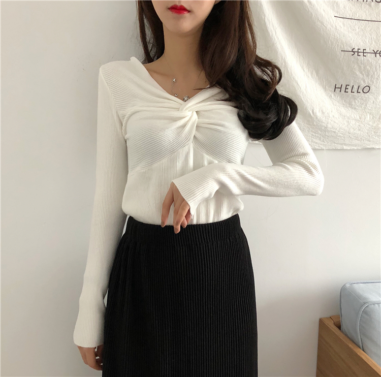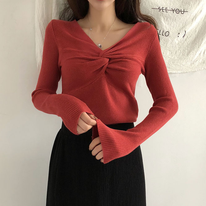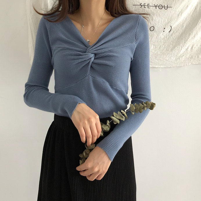 初秋溫柔風毛衣女長袖紐結針織衫韓版港味交叉純色打底衫修身毛衣