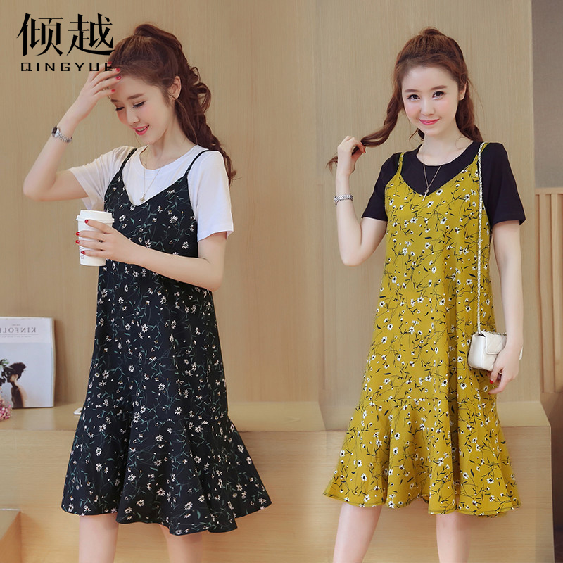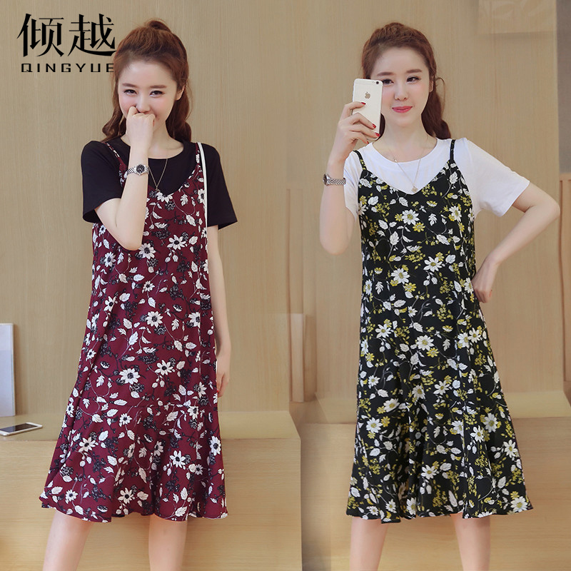 2017夏季吊帶連衣裙女套裝短袖碎花修身顯瘦雪紡中長款兩件套裙子