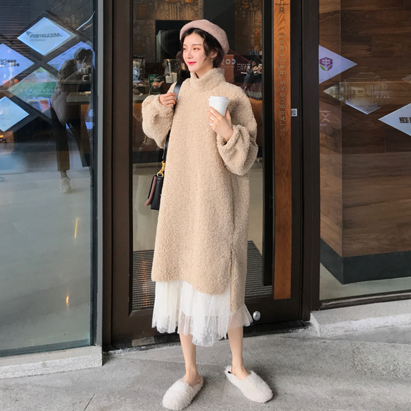 / 洋氣套裝女秋冬2018新款時尚氣質網紗裙寬松高領中長款開叉連衣裙