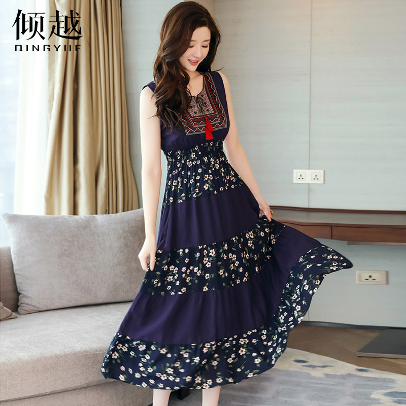 / 傾越韓版文藝顯瘦長裙女2017春裝新款無袖復古印花系帶大擺A字裙